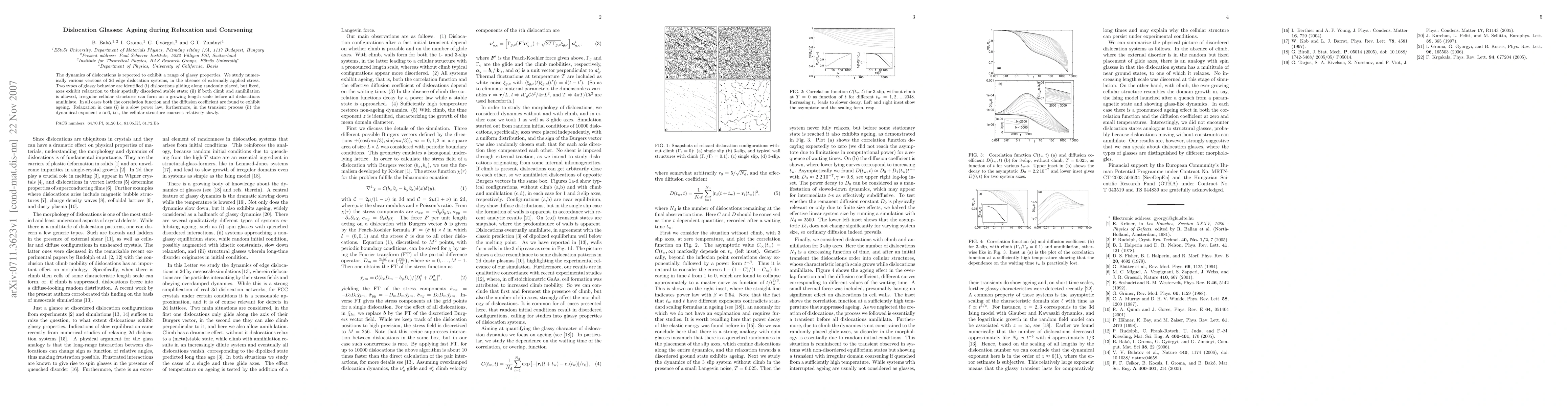 This paper numerically investigates 2D edge dislocation systems, revealing two types of glassy behaviors: (i) dislocations relax via gliding along fixed axes, following a slow power-law relaxation, and (ii) dislocations can form irregular cellular structures before annihilation, with a dynamical exponent of around 6 during coarsening. Both scenarios exhibit aging through correlation function and diffusion coefficient dynamics.