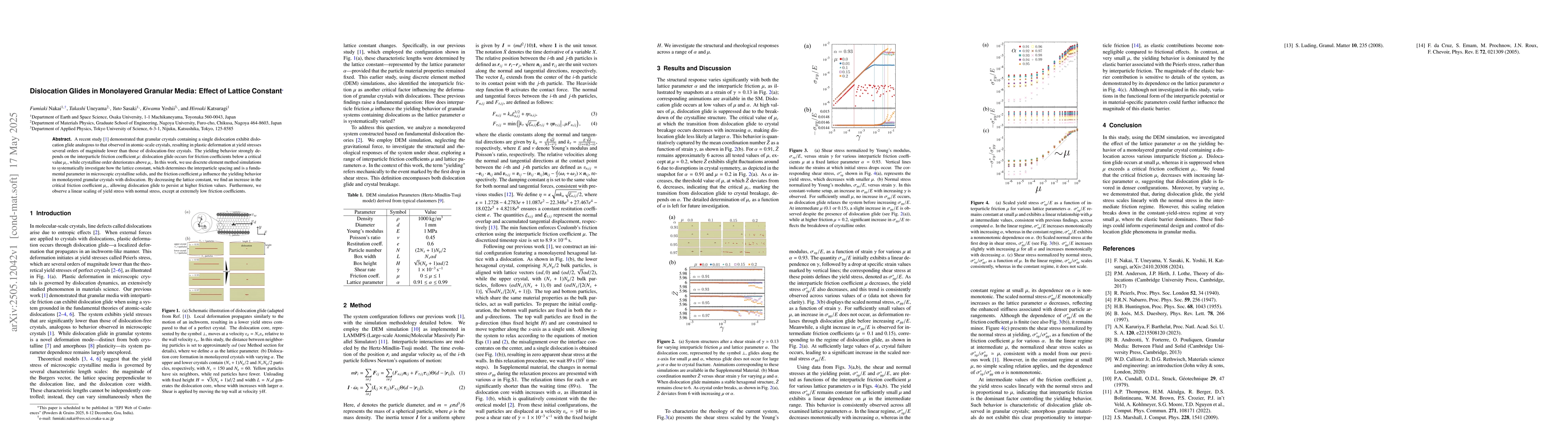 The paper presents a detailed simulation-based analysis of dislocation glide in granular crystals, revealing the effect of lattice constant and friction coefficient on yield stress.