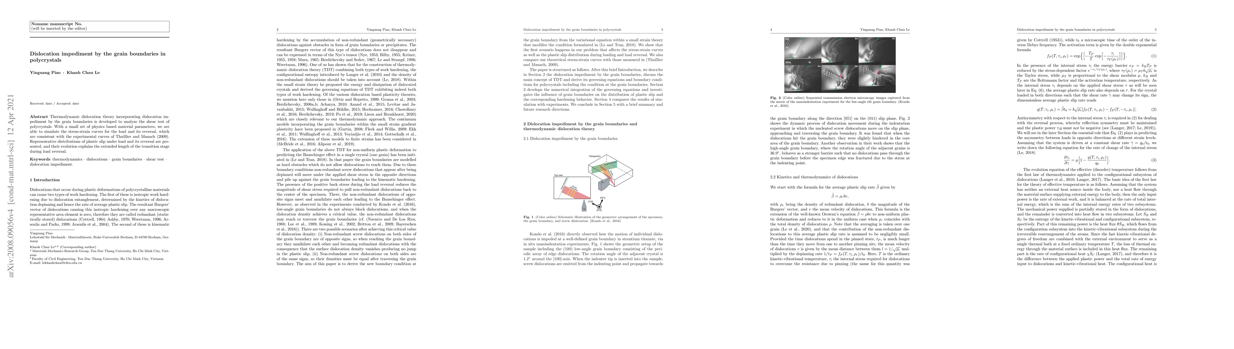 This research develops a thermodynamic dislocation theory to analyze the effect of grain boundaries on dislocation impediment in polycrystals, successfully simulating stress-strain curves that match experimental data. The study explains the extended transition stage during load reversal through representative plastic slip distributions.