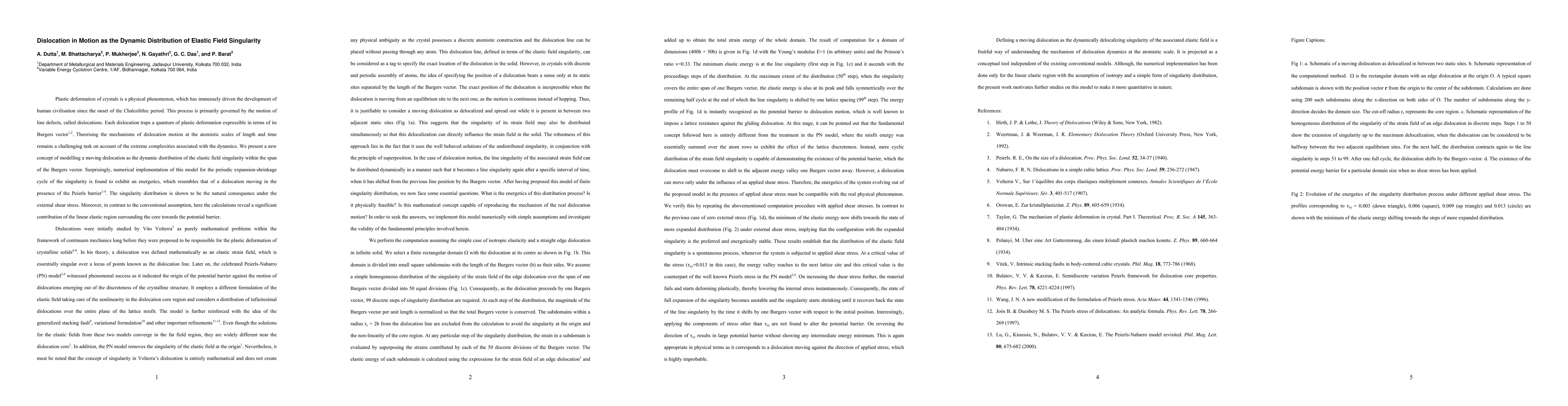 Plastic deformation of crystals is a physical phenomenon, which has immensely driven the development of human civilisation since the onset of the Chalcolithic period. This process is primarily governed by the motion of line defects, called dislocations. Each dislocation traps a quantum of plastic deformation expressible in terms of its Burgers vector[1,2]. Theorising the mechanisms of dislocation motion at the atomistic scales of length and time remains a challenging task on account of the extreme complexities associated with the dynamics. We present a new concept of modelling a moving dislocation as the dynamic distribution of the elastic field singularity within the span of the Burgers vector. Surprisingly, numerical implementation of this model for the periodic expansion-shrinkage cycle of the singularity is found to exhibit an energetics, which resembles that of a dislocation moving in the presence of the Peierls barrier[1-4]. The singularity distribution is shown to be the natural consequence under the external shear stress. Moreover, in contrast to the conventional assumption, here the calculations reveal a significant contribution of the linear elastic region surrounding the core towards the potential barrier.