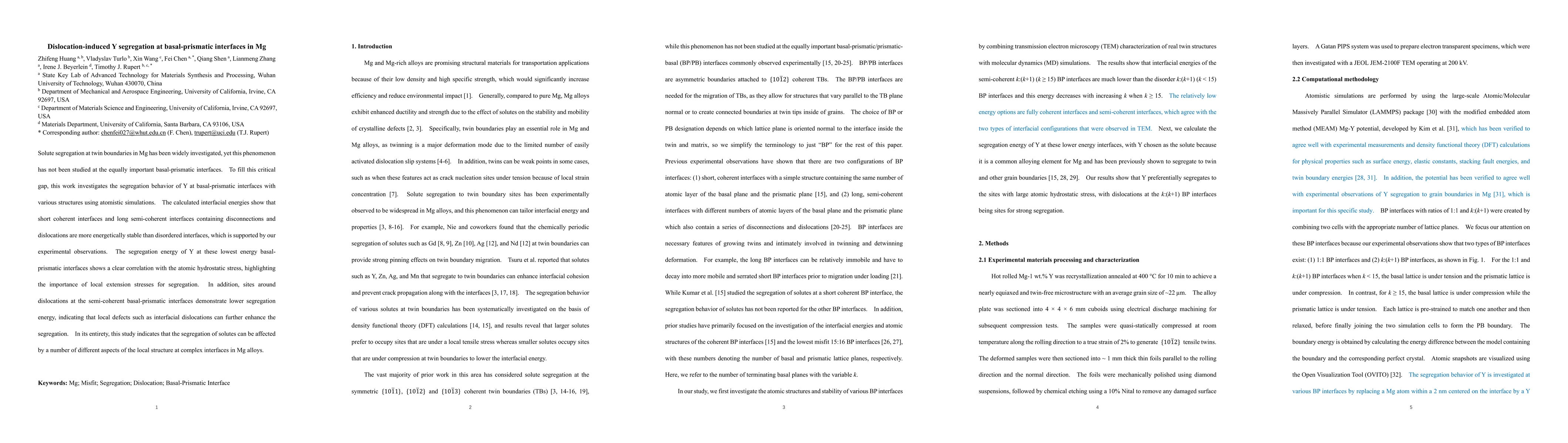 This study investigates Y segregation at basal-prismatic interfaces in Mg using atomistic simulations, revealing that coherent and semi-coherent interfaces with dislocations are more stable. The segregation energy correlates with local atomic hydrostatic stress, indicating that dislocations enhance solute segregation.