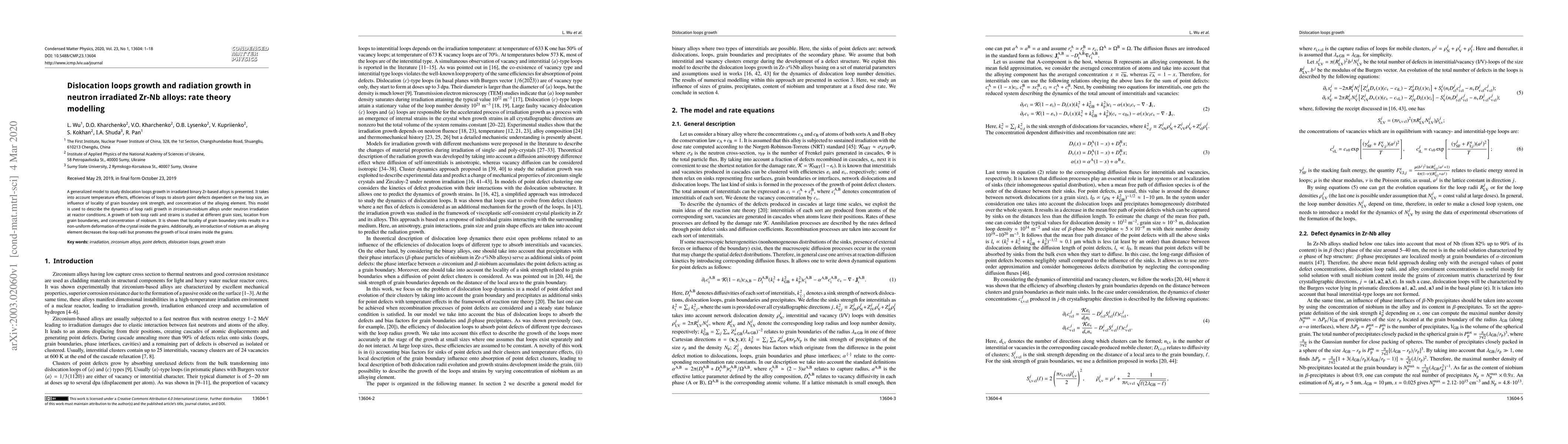 A generalized model to study dislocation loops growth in irradiated binary Zr-based alloys is presented. It takes into account temperature effects, efficiencies of loops to absorb point defects dependent on the loop size, an influence of locality of grain boundary sink strength, and concentration of the alloying element. This model is used to describe the dynamics of loop radii growth in zirconium-niobium alloys under neutron irradiation at reactor conditions. A growth of both loop radii and strains is studied at different grain sizes, location from grain boundaries, and concentration of niobium. It is shown that locality of grain boundary sinks results in a non-uniform deformation of the crystal inside the grains. Additionally, an introduction of niobium as an alloying element decreases the loop radii but promotes the growth of local strains inside the grains.