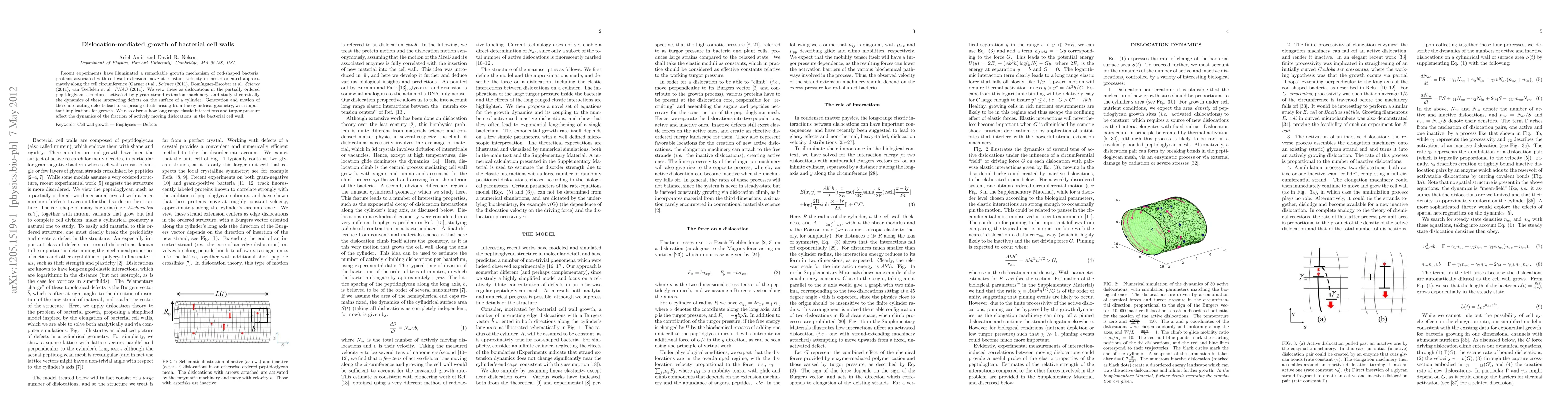 This paper explores the dislocation-mediated growth mechanism in rod-shaped bacteria, where proteins move in circular paths to extend the cell wall, viewed as dislocations in the peptidoglycan structure. The study highlights the dynamic interactions of these defects and the effects of cylindrical geometry on bacterial growth, considering the influence of elastic interactions and turgor pressure.
