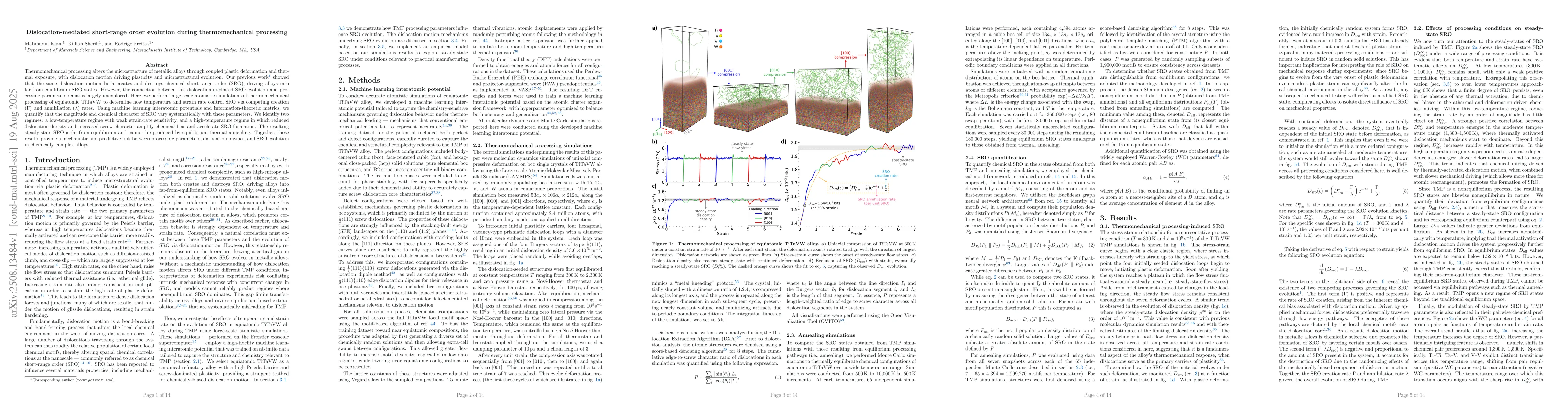 Large-scale atomistic simulations using machine learning interatomic potentials and information-theoretic metrics to study dislocation-mediated short-range order (SRO) evolution in equiatomic TiTaVW alloy under thermomechanical processing (TMP).