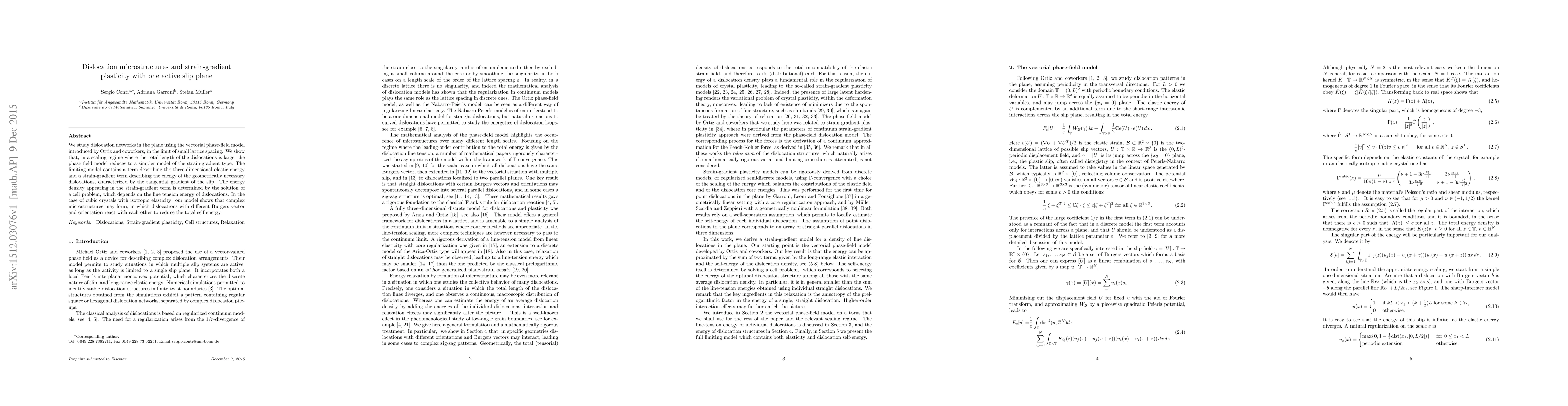 We study dislocation networks in the plane using the vectorial phase-field model introduced by Ortiz and coworkers, in the limit of small lattice spacing. We show that, in a scaling regime where the total length of the dislocations is large, the phase field model reduces to a simpler model of the strain-gradient type. The limiting model contains a term describing the three-dimensional elastic energy and a strain-gradient term describing the energy of the geometrically necessary dislocations, characterized by the tangential gradient of the slip. The energy density appearing in the strain-gradient term is determined by the solution of a cell problem, which depends on the line tension energy of dislocations. In the case of cubic crystals with isotropic elasticity our model shows that complex microstructures may form, in which dislocations with different Burgers vector and orientation react with each other to reduce the total self energy.