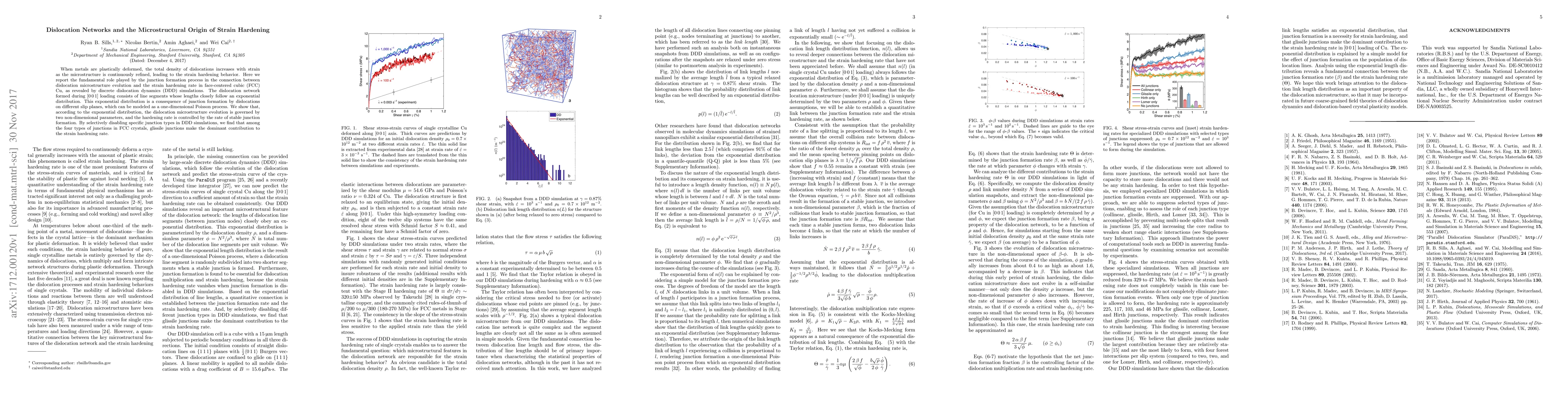 This paper investigates the relationship between dislocation network formation and strain hardening in FCC Cu using DDD simulations, revealing that junction formation processes significantly influence the strain hardening rate, with glissile junctions playing the most crucial role. The study finds that the dislocation lengths follow an exponential distribution due to junction formation, governed by two non-dimensional parameters.