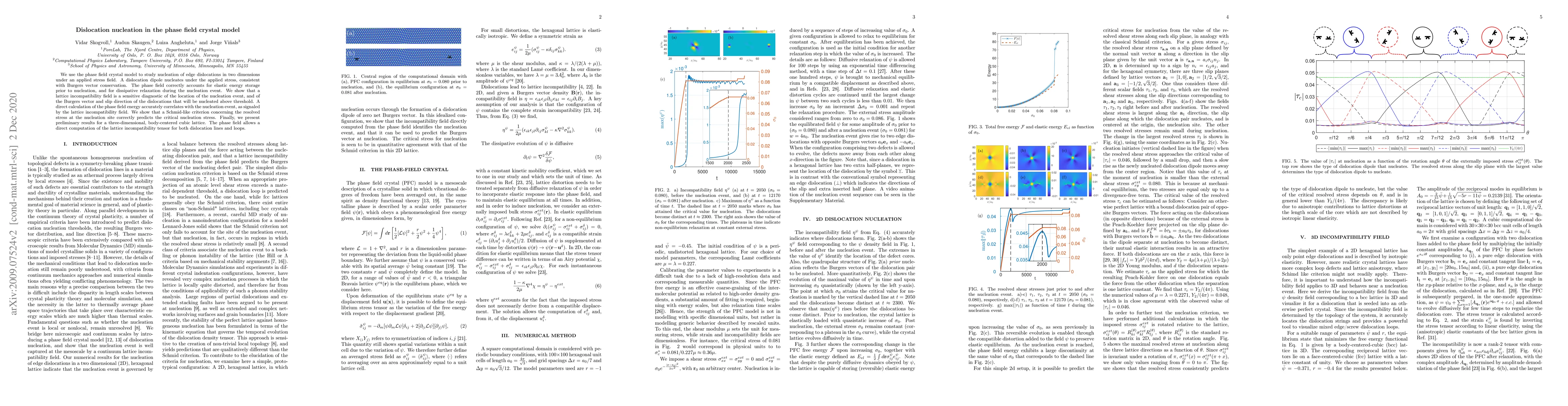 This paper investigates the nucleation of edge dislocations in two dimensions using the phase field crystal model under applied stress, showing that dislocation dipoles form while conserving Burgers vectors. The model effectively captures elastic energy and lattice incompatibility fields, predicting critical nucleation stress based on resolved stress criteria.