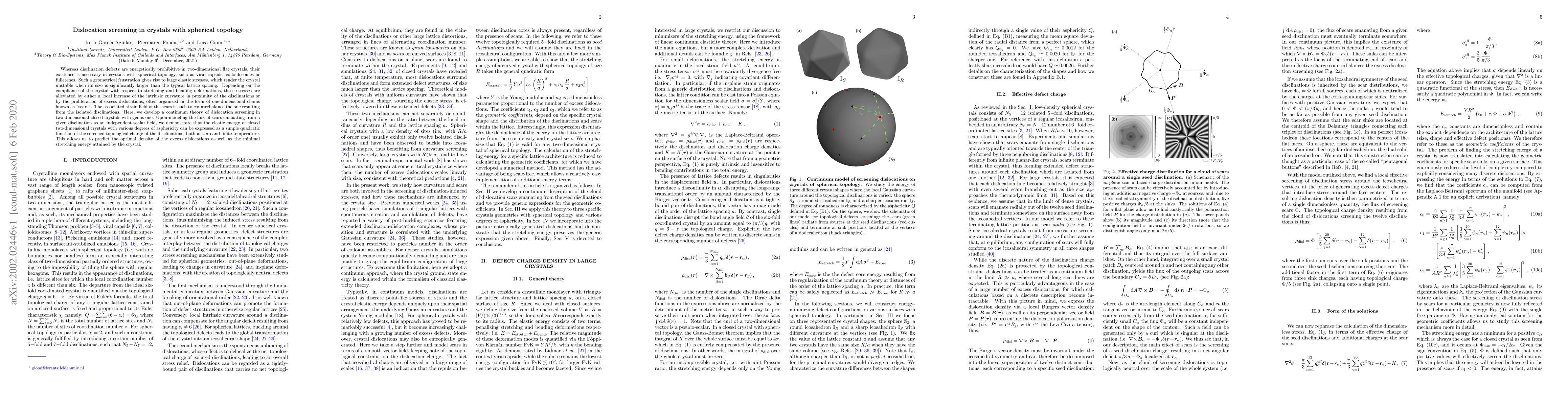 Whereas disclination defects are energetically prohibitive in two-dimensional flat crystals, their existence is necessary in crystals with spherical topology, such as viral capsids, colloidosomes or fullerenes. Such a geometrical frustration gives rise to large elastic stresses, which render the crystal unstable when its size is significantly larger than the typical lattice spacing. Depending on the compliance of the crystal with respect to stretching and bending deformations, these stresses are alleviated by either a local increase of the intrinsic curvature in proximity of the disclinations or by the proliferation of excess dislocations, often organized in the form of one-dimensional chains known as "scars". The associated strain field of the scars is such to counterbalance the one resulting from the isolated disclinations. Here, we develop a continuum theory of dislocation screening in two-dimensional closed crystals with genus one. Upon modeling the flux of scars emanating from a given disclination as an independent scalar field, we demonstrate that the elastic energy of closed two-dimensional crystals with various degrees of asphericity can be expressed as a simple quadratic function of the screened topological charge of the disclinations, both at zero and finite temperature. This allows us to predict the optimal density of the excess dislocations as well as the minimal stretching energy attained by the crystal.