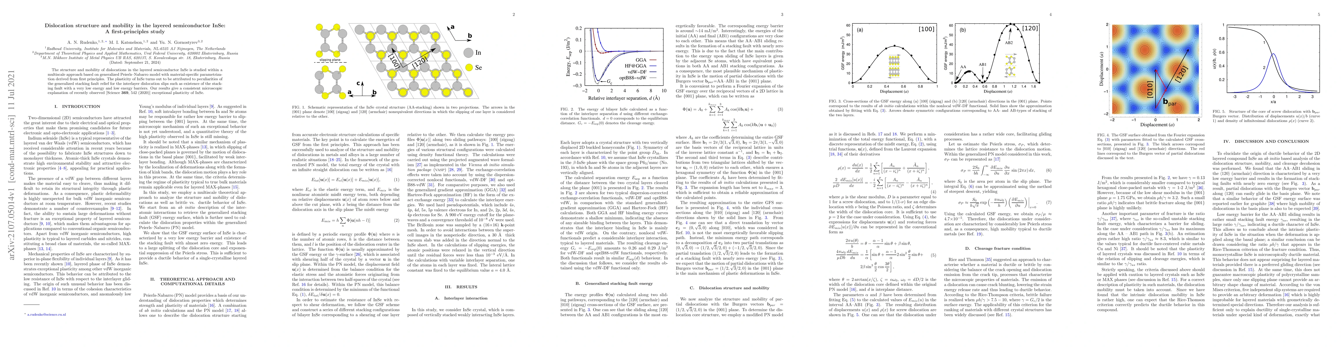 This study uses first-principles to investigate dislocation structure and mobility in InSe, revealing low-energy barriers and a low-energy stacking fault that explain the material's exceptional plasticity, consistent with recent experimental observations.