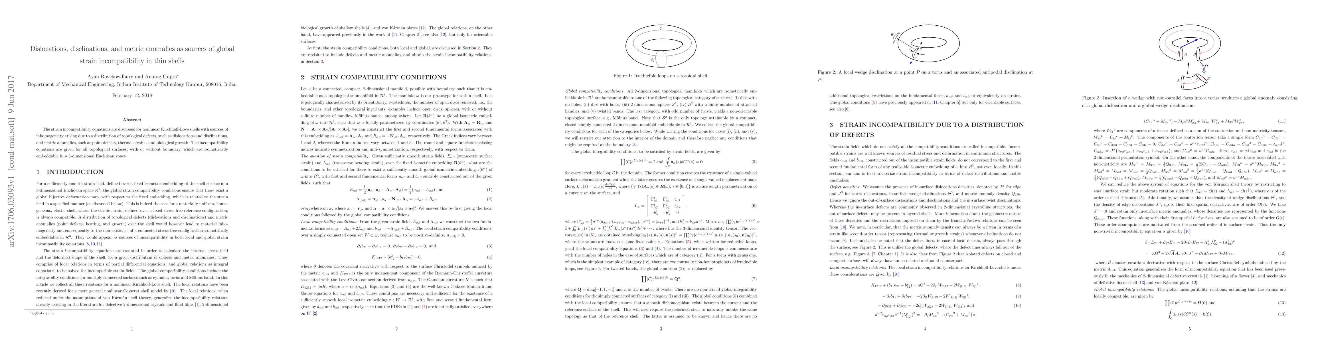 This paper explores the strain incompatibility equations for nonlinear Kirchhoff-Love shells, attributing inhomogeneity to dislocations, disclinations, and metric anomalies. It provides incompatibility equations for topological surfaces embedded in 3D Euclidean space, considering both bounded and unbounded cases.