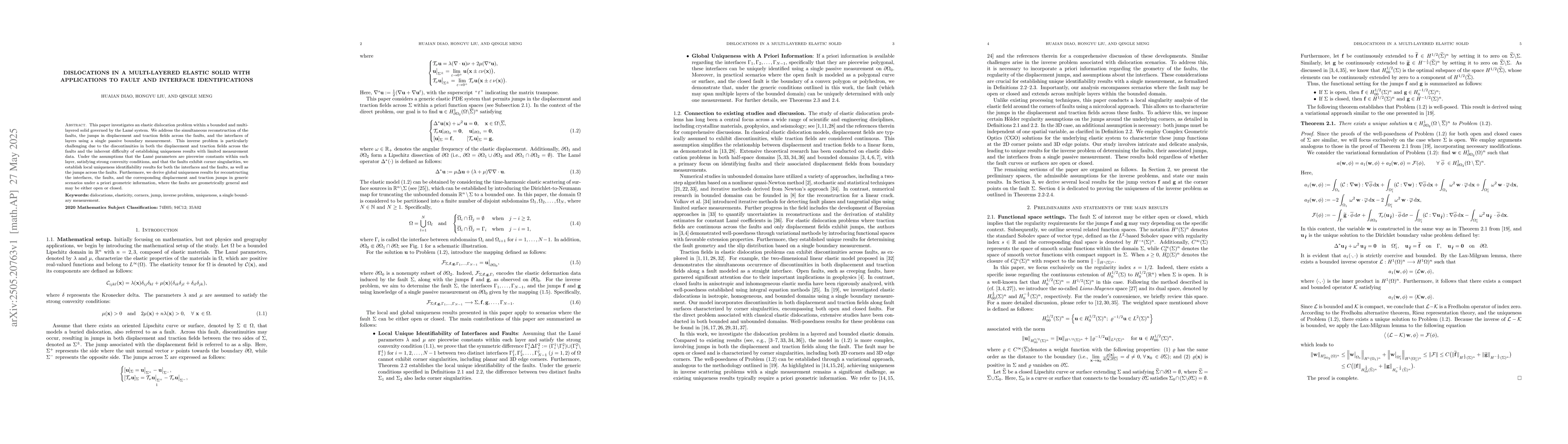 Researchers developed a method to reconstruct faults, interfaces, and displacement jumps in layered elastic solids using limited measurement data, establishing local uniqueness results for specific scenarios and global uniqueness for generic cases.