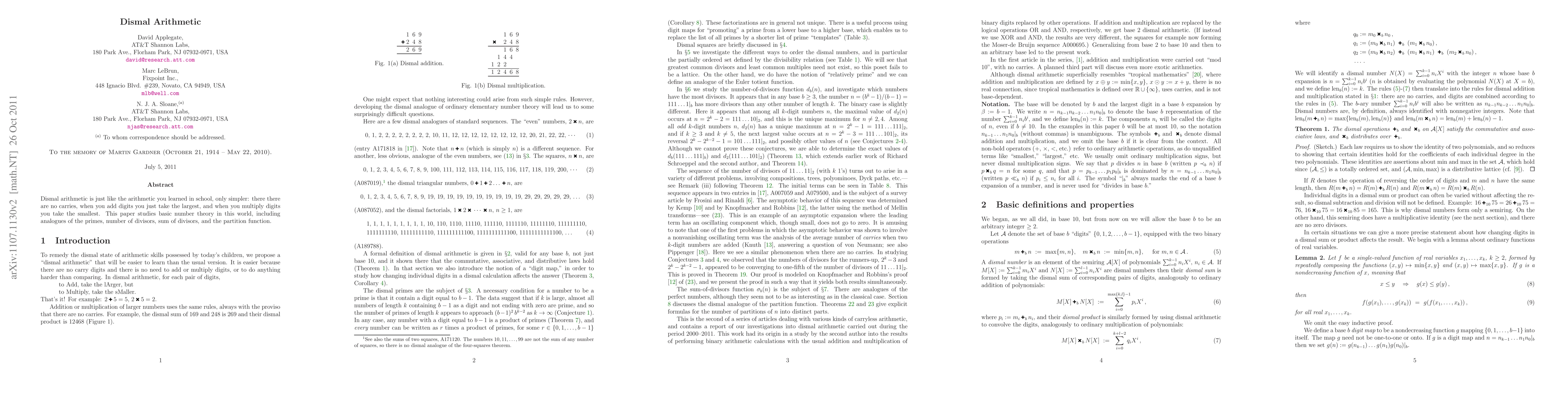 This paper explores a simplified arithmetic system where no carries occur in addition and the smallest product is chosen in multiplication. It investigates number theory concepts such as primes, divisors, and partitions within this unique arithmetic framework.