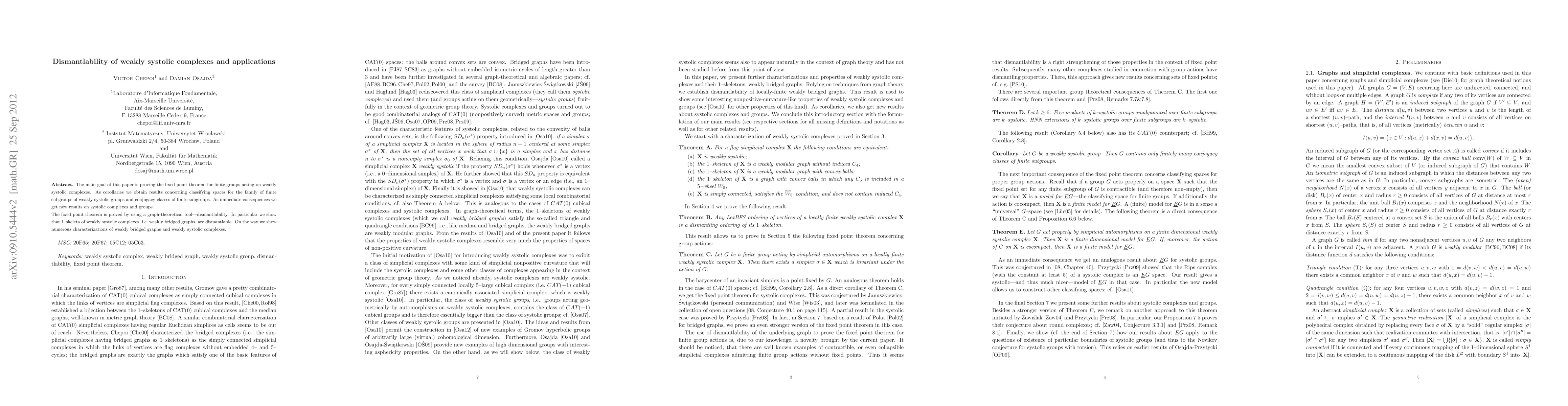 The paper introduces a novel proof of the fixed point theorem for finite group actions on weakly systolic complexes using dismantlability, a concept from graph theory.