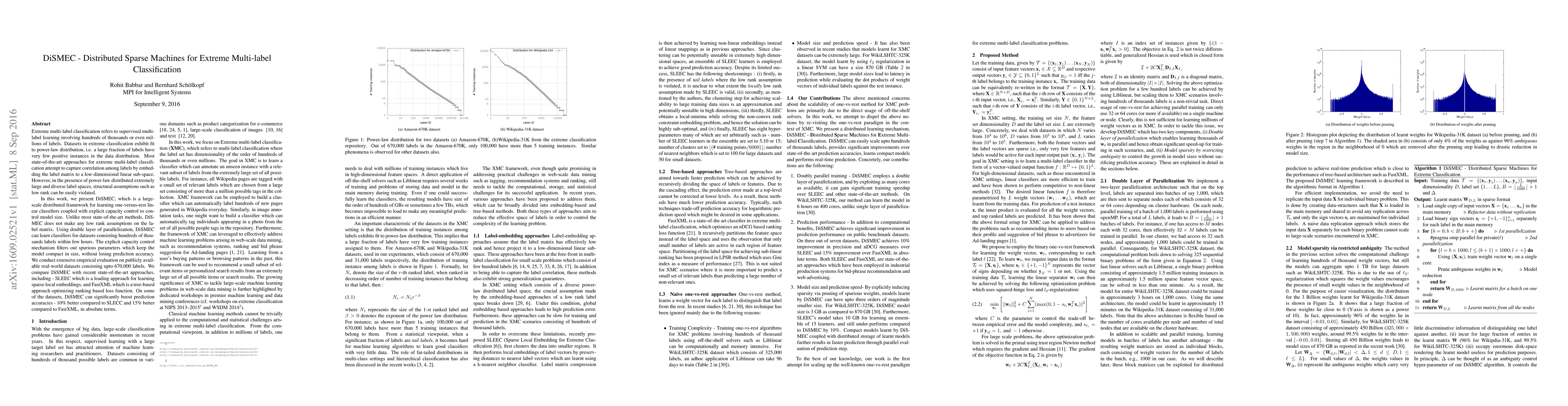 DiSMEC is a distributed framework for extreme multi-label classification that avoids low-rank assumptions and employs explicit capacity control to manage model size. It significantly improves prediction accuracy on large datasets with hundreds of thousands of labels, outperforming state-of-the-art methods by up to 15%.