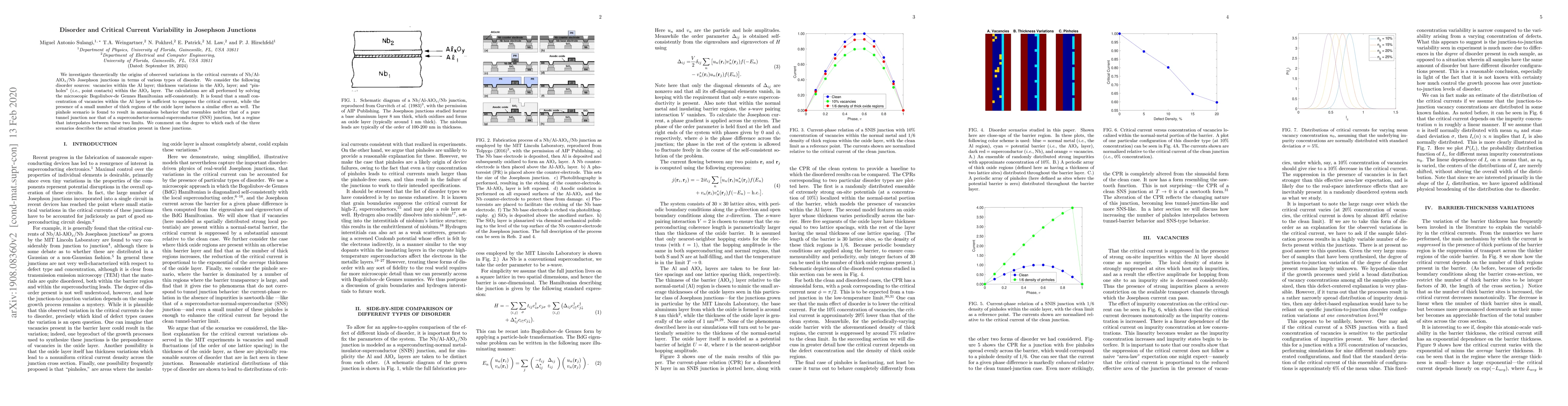 We investigate theoretically the origins of observed variations in the critical currents of Nb/Al-AlO$_x$/Nb Josephson junctions in terms of various types of disorder. We consider the following disorder sources: vacancies within the Al layer; thickness variations in the AlO$_x$ layer; and "pinholes" (i.e., point contacts) within the AlO$_x$ layer. The calculations are all performed by solving the microscopic Bogoliubov-de Gennes Hamiltonian self-consistently. It is found that a small concentration of vacancies within the Al layer is sufficient to suppress the critical current, while the presence of a small number of thick regions of the oxide layer induces a similar effect as well. The pinhole scenario is found to result in anomalous behavior that resembles neither that of a pure tunnel junction nor that of an SNS junction, but a regime that interpolates between these two limits. We comment on the degree to which each of the three scenarios describes the actual situation present in these junctions.