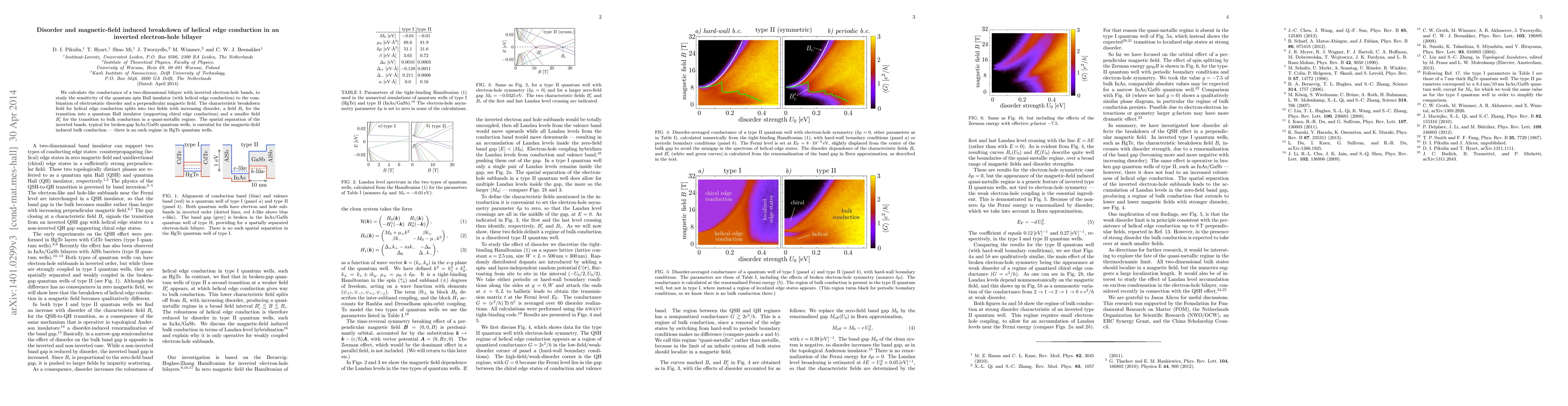 This paper investigates the conductance of an inverted electron-hole bilayer under electrostatic disorder and magnetic fields, revealing that helical edge conduction breaks down into two distinct fields: $B_{c}$ for transitioning to a quantum Hall insulator and $B'_{c}$ for bulk conduction in a quasi-metallic state. The spatial separation of inverted bands in materials like InAs/GaSb is crucial for the latter transition, unlike HgTe quantum wells.