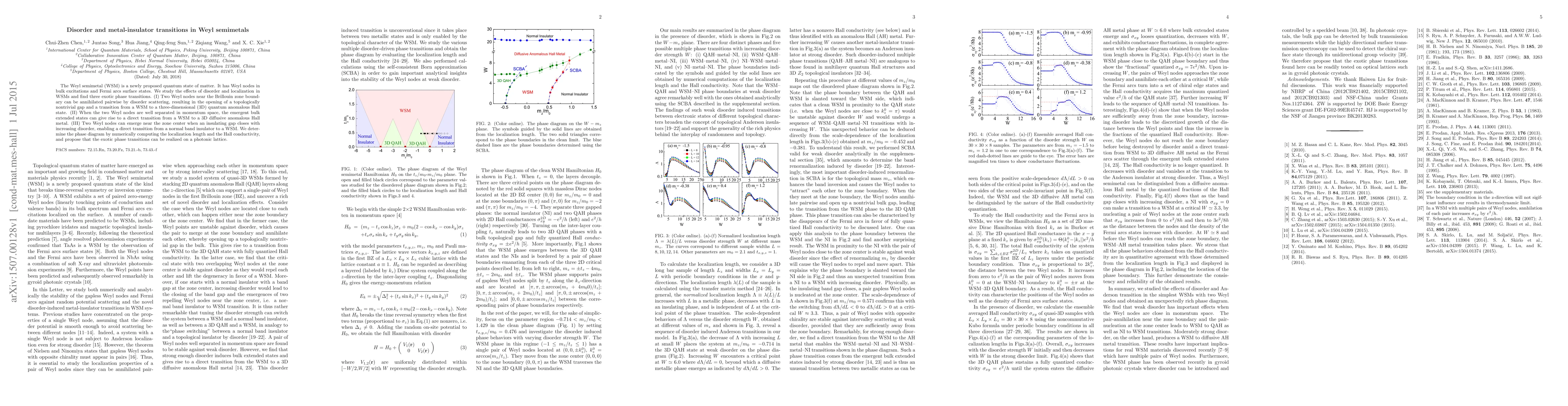 The paper explores disorder-induced phase transitions in Weyl semimetals, revealing three exotic transitions: (1) Pairwise annihilation of Weyl nodes leads to a topological gap and a quantum anomalous Hall state. (2) Separated Weyl nodes result in a diffusive anomalous Hall metal. (3) Disorder closing an insulating gap creates Weyl nodes, transitioning a normal insulator into a Weyl semimetal.
