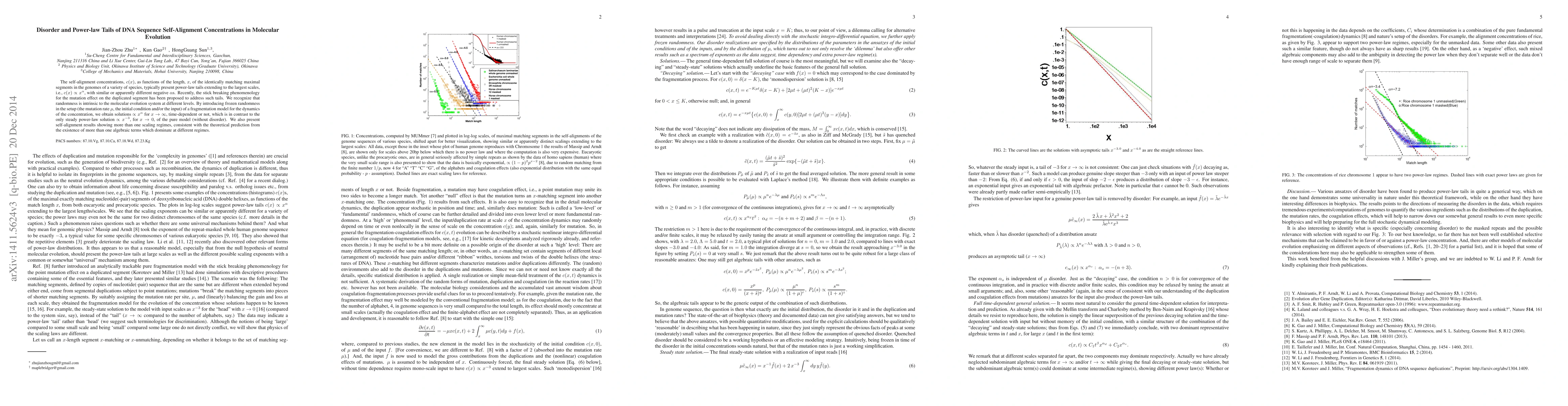 The self-alignment concentrations, $c(x)$, as functions of the length, $x$, of the identically matching maximal segments in the genomes of a variety of species, typically present power-law tails extending to the largest scales, i.e., $c(x) \propto x^{\alpha}$, with similar or apparently different negative $\alpha$s ($<-2$). The relevant fundamental processes of molecular evolution are segmental duplication and point mutation, and that recently the stick fragmentation phenomenology has been used to account the neutral evolution. However, disorder is intrinsic to the evolution system and, by freezing it in time (quenching) for the setup of a simple fragmentation model, we obtain decaying, steady-state and the general full time-dependent solutions, all $\propto x^{\alpha}$ for $x\to \infty$, which is in contrast to the only power-law solution, $x^{-3}$ for $x\to 0$ of the pure model (without disorder). %Other algebraic terms may dominate at intermediate scales, which seems to be confirmed by some species, such as rice. We also present self-alignment results showing more than one scaling regimes, consistent with the theoretical results of the existence of more than one algebraic terms which dominate at different regimes.