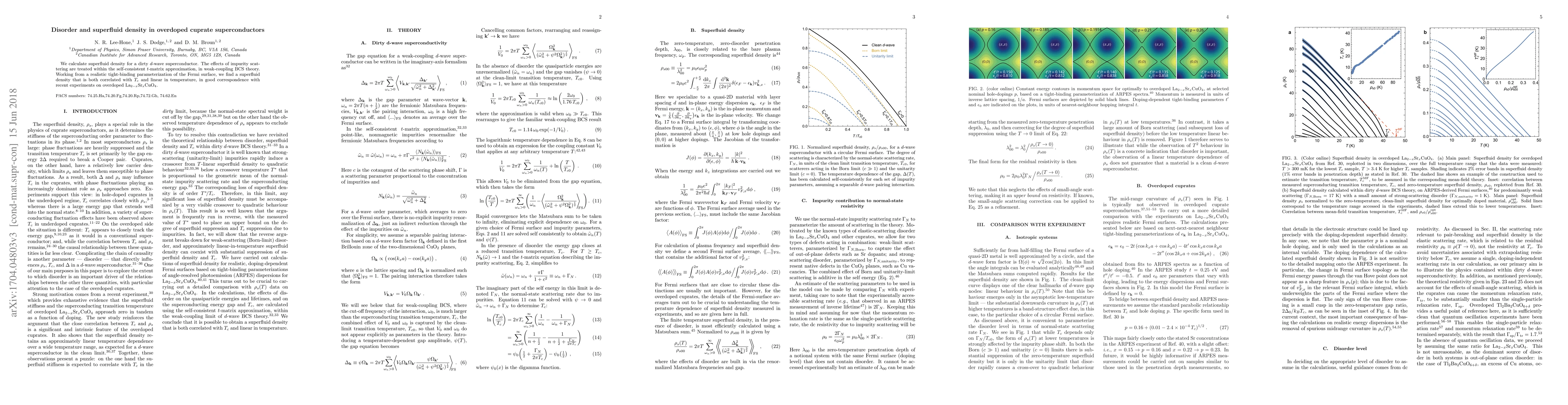 This paper calculates superfluid density in overdoped cuprate superconductors using a self-consistent t-matrix approximation, finding a density that correlates with T_c and is linear in temperature, aligning well with experimental results on La2-xSrxCuO4.