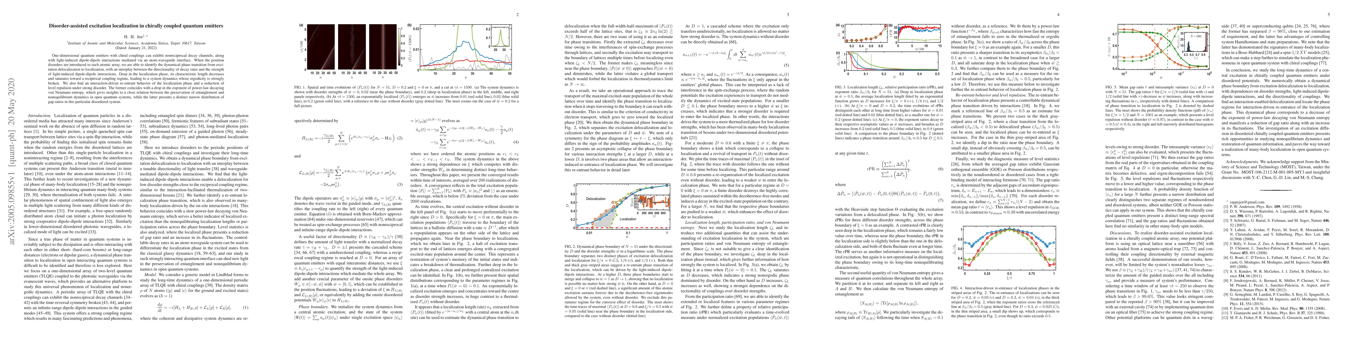 This paper investigates how disorder in chirally coupled quantum emitters leads to a transition from excitation delocalization to localization, revealing a complex interplay between decay rates and dipole-dipole interactions. It finds that strong disorder induces a re-entrant localization phase and reduces level repulsion, providing insights into entanglement preservation and nonequilibrium dynamics in open quantum systems.
