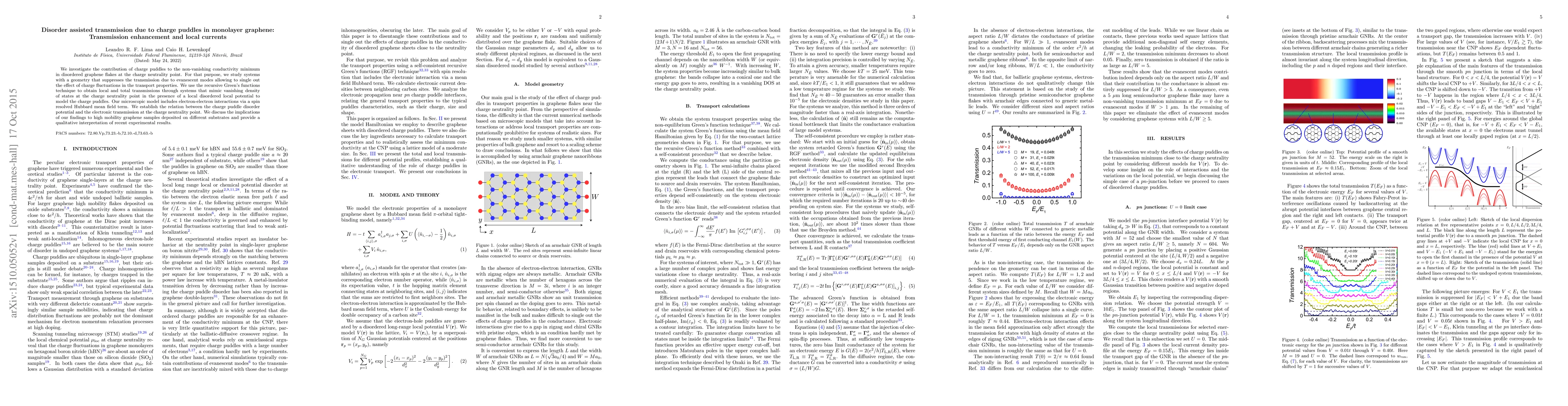 We investigate the contribution of charge puddles to the non-vanishing conductivity minimum in disordered graphene flakes at the charge neutrality point. For that purpose, we study systems with a geometry that suppresses the transmission due to evanescent modes allowing to single out the effect of charge fluctuations in the transport properties. We use the recursive Green's functions technique to obtain local and total transmissions through systems that mimic vanishing density of states at the charge neutrality point in the presence of a local disordered local potential to model the charge puddles. Our microscopic model includes electron-electron interactions via a spin resolved Hubbard mean field term. We establish the relation between the charge puddle disorder potential and the electronic transmission at the charge neutrality point. We discuss the implications of our findings to high mobility graphene samples deposited on different substrates and provide a qualitative interpretation of recent experimental results.