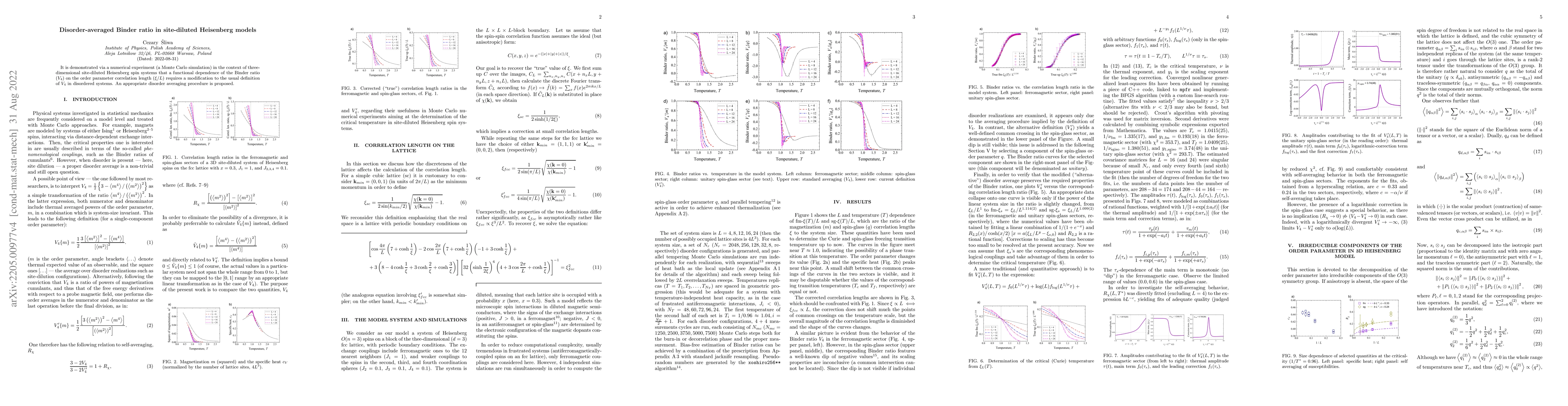 This study uses Monte Carlo simulations to show that the Binder ratio in three-dimensional site-diluted Heisenberg spin systems requires modification in its definition for disordered systems. A new disorder-averaging method is proposed to accurately reflect the functional dependence of the Binder ratio on the order parameter correlation length.