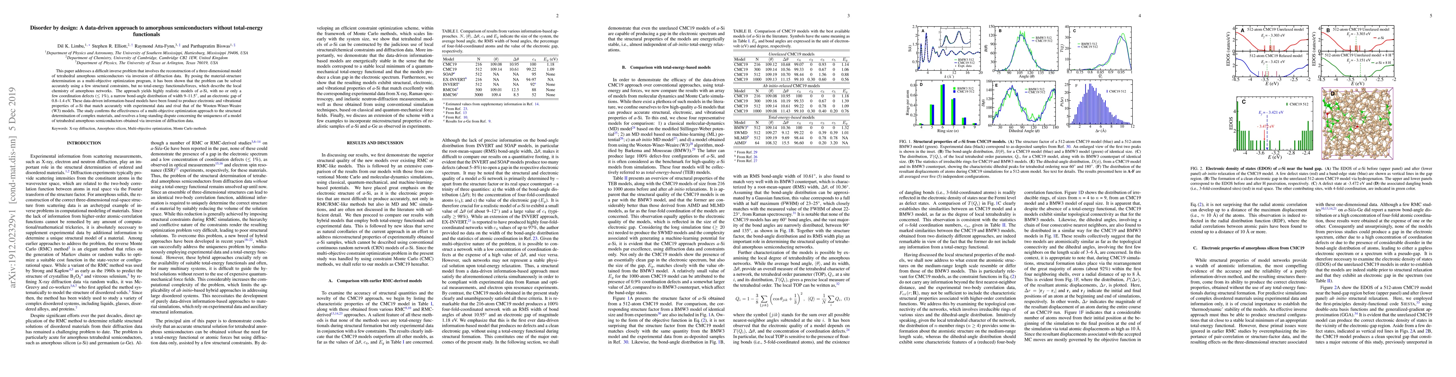 This paper addresses a difficult inverse problem that involves the reconstruction of a three-dimensional model of tetrahedral amorphous semiconductors via inversion of diffraction data. By posing the material-structure determination as a multi-objective optimization program, it has been shown that the problem can be solved accurately using a few structural constraints, but no total-energy functionals/forces, which describe the local chemistry of amorphous networks. The approach yields highly realistic models of amorphous silicon, with no or only a few coordination defects ($\le$ 1%), a narrow bond-angle distribution of width 9-11.5 degree, and an electronic gap of 0.8-1.4 eV. These data-driven information-based models have been found to produce electronic and vibrational properties of amorphous silicon that match accurately with experimental data and rival that of the Wooten-Winer-Weaire (W3) models. The study confirms the effectiveness of a multi-objective optimization approach to the structural determination of complex materials, and resolves a long-standing dispute concerning the uniqueness of a model of tetrahedral amorphous semiconductors obtained via inversion of diffraction data.