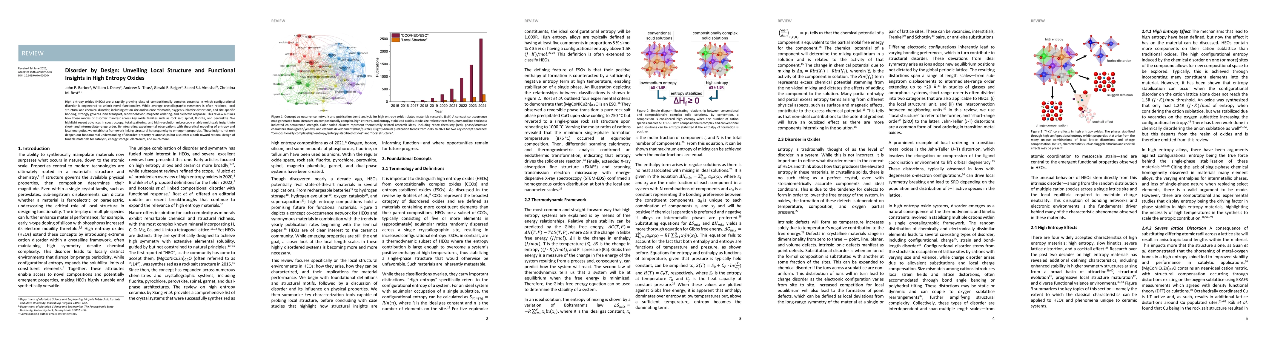 High entropy oxides (HEOs) are a rapidly growing class of compositionally complex ceramics in which configurational disorder is engineered to unlock novel functionality. While average crystallographic symmetry is often retained, local structural and chemical disorder, including cation size and valence mismatch, oxygen sublattice distortions, and site-specific bonding, strongly governs ionic transport, redox behavior, magnetic ordering, and dielectric response. This review outlines how these modes of disorder manifest across key oxide families such as rock salt, spinel, fluorite, and perovskite. We highlight recent advances in spectroscopy, total scattering, and high-resolution microscopy enable multi-scale insight into short- and intermediate-range order. By integrating experimental observations with theoretical modeling of entropy and local energetics, we establish a framework linking structural heterogeneity to emergent properties. These insights not only deepen our fundamental understanding of disorder-property relationships but also offer a path toward rational design of tunable materials for catalysis, energy storage, electronics, and much more.