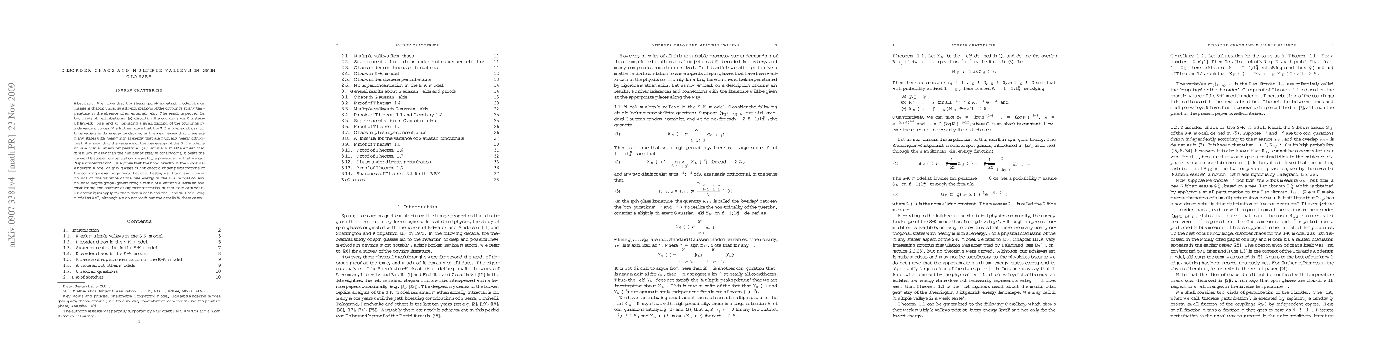 We prove that the Sherrington-Kirkpatrick model of spin glasses is chaotic under small perturbations of the couplings at any temperature in the absence of an external field. The result is proved for two kinds of perturbations: (a) distorting the couplings via Ornstein-Uhlenbeck flows, and (b) replacing a small fraction of the couplings by independent copies. We further prove that the S-K model exhibits multiple valleys in its energy landscape, in the weak sense that there are many states with near-minimal energy that are mutually nearly orthogonal. We show that the variance of the free energy of the S-K model is unusually small at any temperature. (By `unusually small' we mean that it is much smaller than the number of sites; in other words, it beats the classical Gaussian concentration inequality, a phenomenon that we call `superconcentration'.) We prove that the bond overlap in the Edwards-Anderson model of spin glasses is not chaotic under perturbations of the couplings, even large perturbations. Lastly, we obtain sharp lower bounds on the variance of the free energy in the E-A model on any bounded degree graph, generalizing a result of Wehr and Aizenman and establishing the absence of superconcentration in this class of models. Our techniques apply for the p-spin models and the Random Field Ising Model as well, although we do not work out the details in these cases.