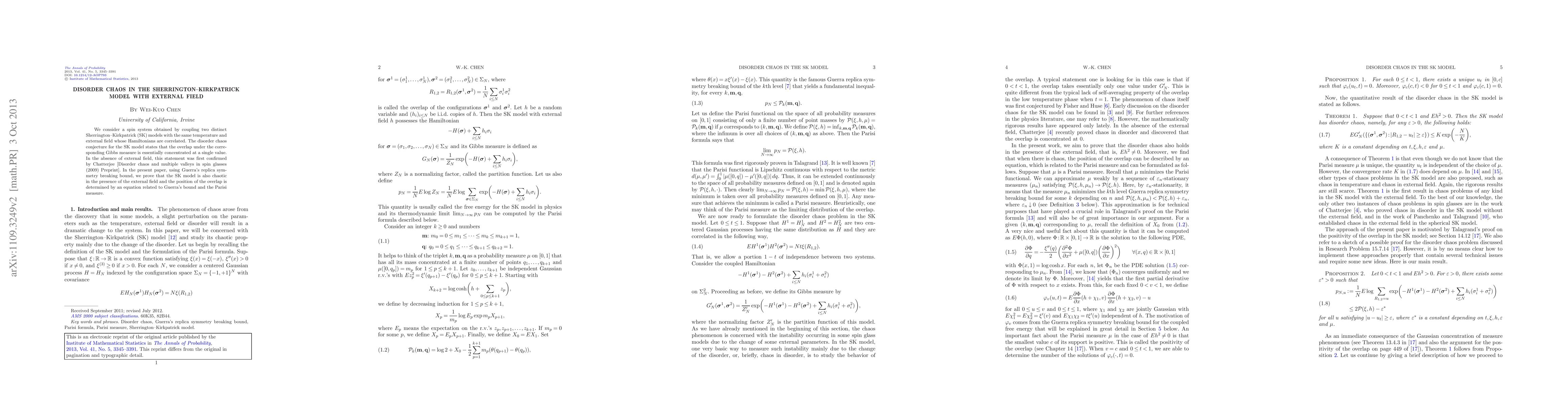 This paper proves that the Sherrington-Kirkpatrick model remains in disorder chaos under an external field, confirming the conjecture that overlaps are concentrated at a single value. The authors utilize Guerra's replica symmetry breaking bound to establish this chaos in the presence of an external field.