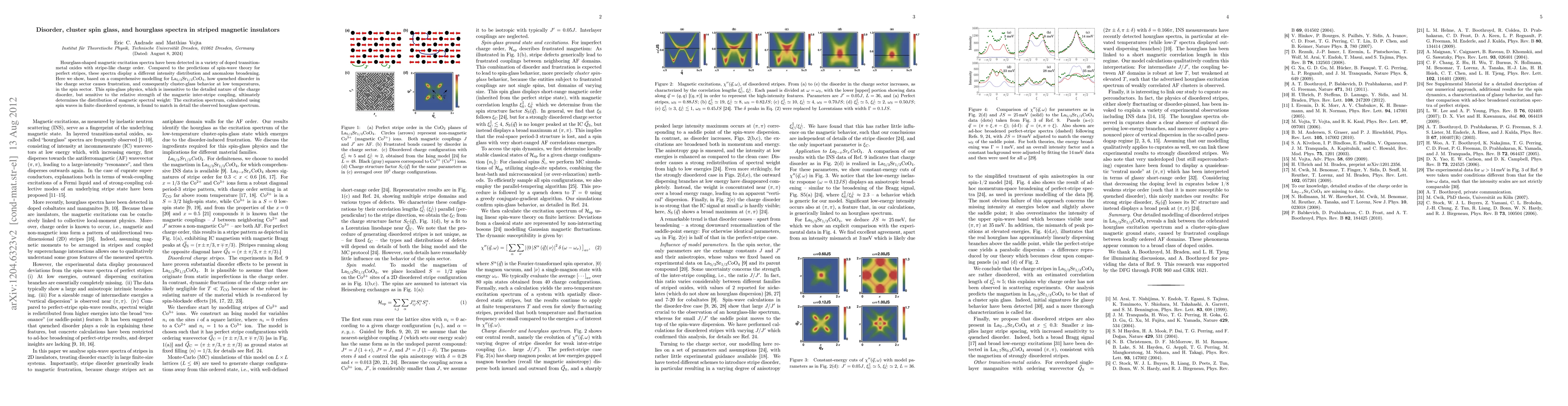This paper investigates the magnetic excitation spectra in doped transition-metal oxides with stripe-like charge order, revealing hour-glass-shaped spectra due to quenched disorder causing frustration and cluster-glass behavior in the spin sector, which determines the unique spectral distribution.