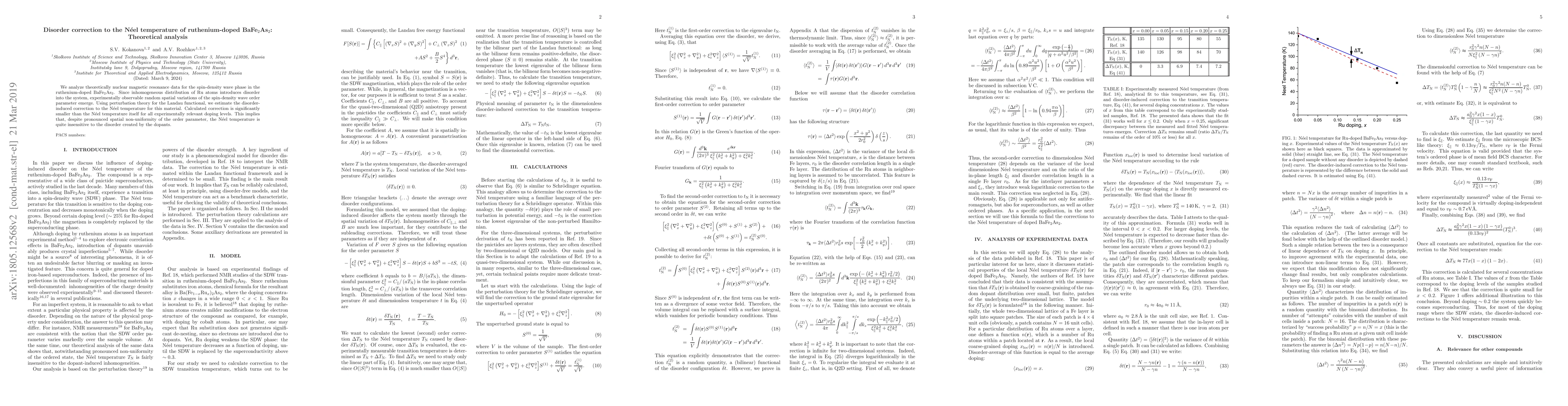 This paper theoretically analyzes nuclear magnetic resonance data for ruthenium-doped BaFe$_2$As$_2$ to determine the disorder-induced correction to its Néel temperature. The study finds that the disorder from inhomogeneous Ru distribution has a negligible effect on the Néel temperature, indicating high insensitivity to dopant-induced disorder.