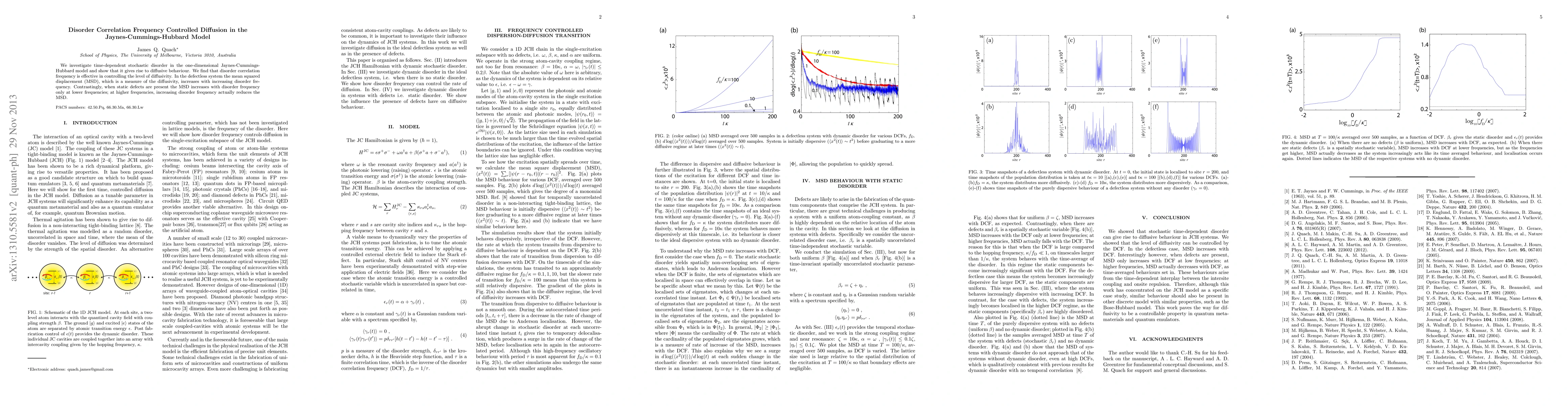 We investigate time-dependent stochastic disorder in the one-dimensional Jaynes-Cummings-Hubbard model and show that it gives rise to diffusive behaviour. We find that disorder correlation frequency is effective in controlling the level of diffusivity. In the defectless system the mean squared displacement (MSD), which is a measure of the diffusivity, increases with increasing disorder frequency. Contrastingly, when static defects are present the MSD increases with disorder frequency only at lower frequencies; at higher frequencies, increasing disorder frequency actually reduces the MSD.