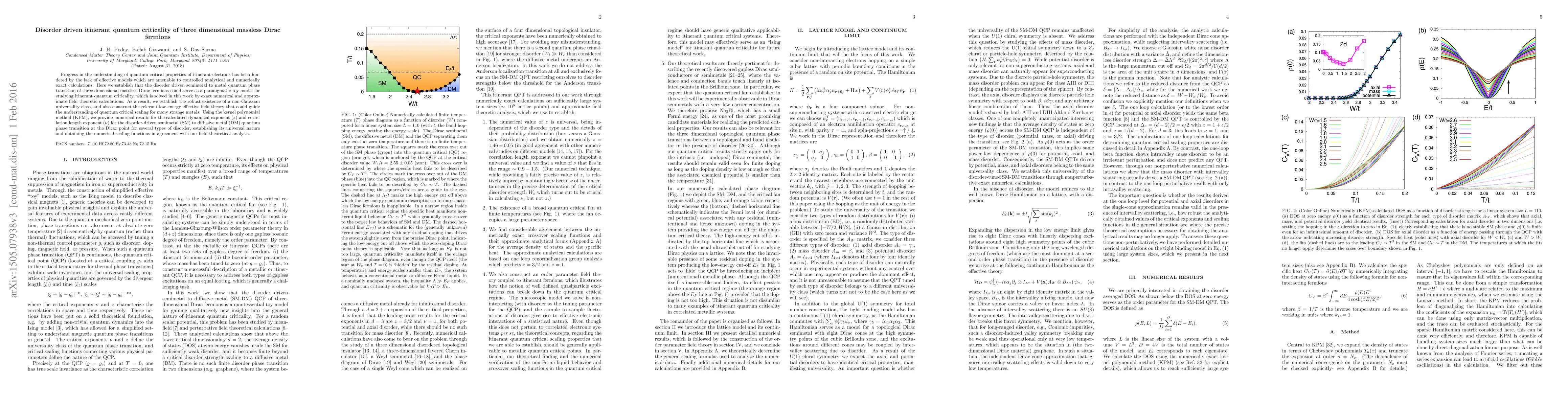 This paper establishes a three-dimensional massless Dirac fermion model for studying itinerant quantum criticality, demonstrating its robustness through exact numerical and field theory calculations. It identifies a non-Gaussian universality class and provides numerical results for dynamical and correlation length exponents, confirming the universal nature of the disorder-driven quantum phase transition.