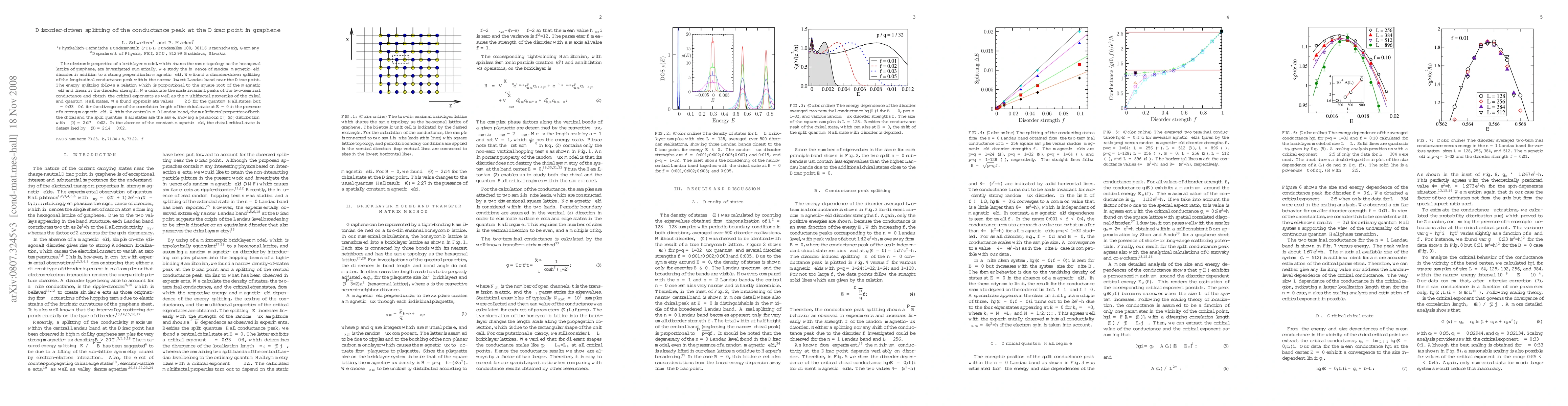 The electronic properties of a bricklayer model, which shares the same topology as the hexagonal lattice of graphene, are investigated numerically. We study the influence of random magnetic-field disorder in addition to a strong perpendicular magnetic field. We found a disorder-driven splitting of the longitudinal conductance peak within the narrow lowest Landau band near the Dirac point. The energy splitting follows a relation which is proportional to the square root of the magnetic field and linear in the disorder strength. We calculate the scale invariant peaks of the two-terminal conductance and obtain the critical exponents as well as the multifractal properties of the chiral and quantum Hall states. We found approximate values $\nu\approx 2.5$ for the quantum Hall states, but $\nu=0.33\pm 0.1$ for the divergence of the correlation length of the chiral state at E=0 in the presence of a strong magnetic field. Within the central $n=0$ Landau band, the multifractal properties of both the chiral and the split quantum Hall states are the same, showing a parabolic $f[\alpha(s)]$ distribution with $\alpha(0)=2.27\pm 0.02$. In the absence of the constant magnetic field, the chiral critical state is determined by $\alpha(0)=2.14\pm 0.02$.