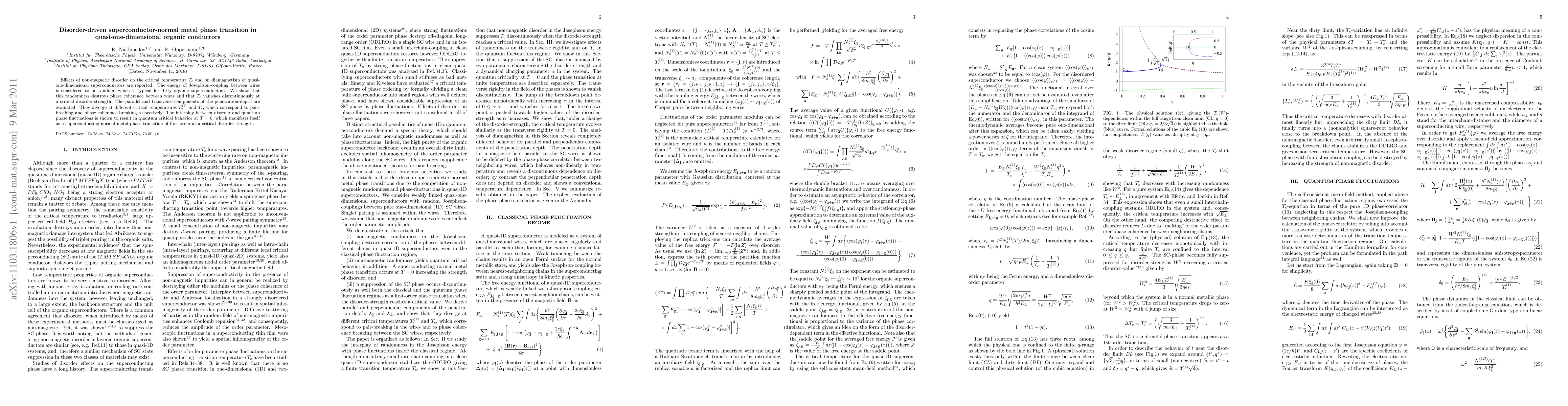 This paper investigates how non-magnetic disorder affects the critical temperature T_c and diamagnetism in quasi-one-dimensional superconductors, revealing that random Josephson-coupling energy leads to a first-order superconducting-normal metal phase transition at a critical disorder strength. The study finds that T_c vanishes discontinuously and the penetration-depth components diverge at different critical temperatures, indicating pair-breaking and phase-coherence breaking.