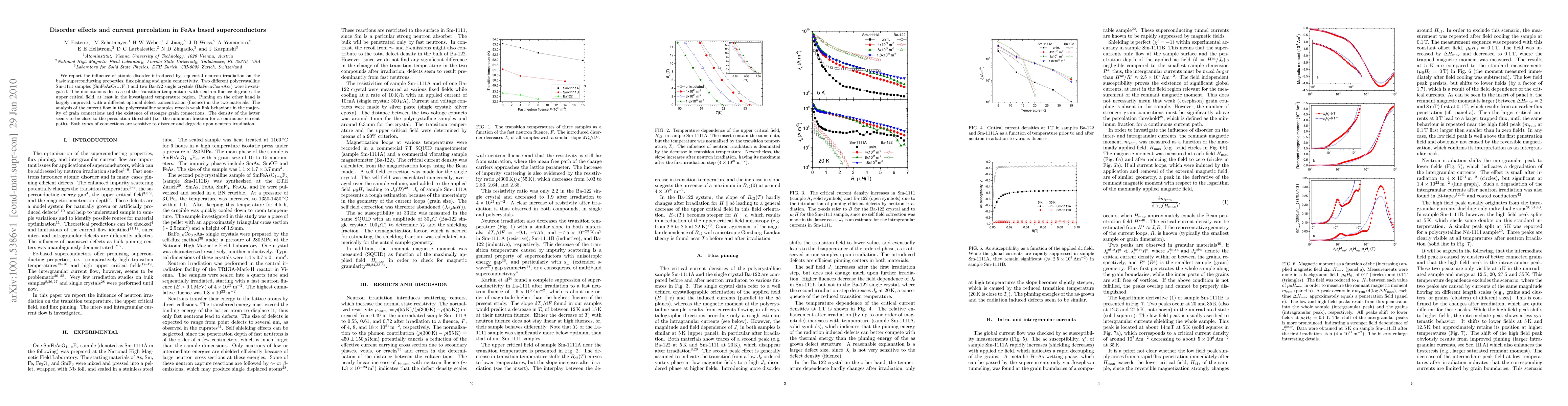 We report the influence of atomic disorder introduced by sequential neutron irradiation on the basic superconducting properties, flux pinning and grain connectivity. Two different polycrystalline Sm-1111 samples (SmFeAsO_{1-x}F_x) and two Ba-122 single crystals (BaFe_{1.8}Co_{0.2}As_2) were investigated. The monotonous decrease of the transition temperature with neutron fluence degrades the upper critical field, at least in the investigated temperature region. Pinning on the other hand is largely improved, with a different optimal defect concentration (fluence) in the two materials. The analysis of the current flow in the polycrystalline samples reveals weak link behaviour in the majority of grain connections and the existence of stronger grain connections. The density of the latter seems to be close to the percolation threshold (i.e. the minimum fraction for a continuous current path). Both types of connections are sensitive to disorder and degrade upon neutron irradiation.