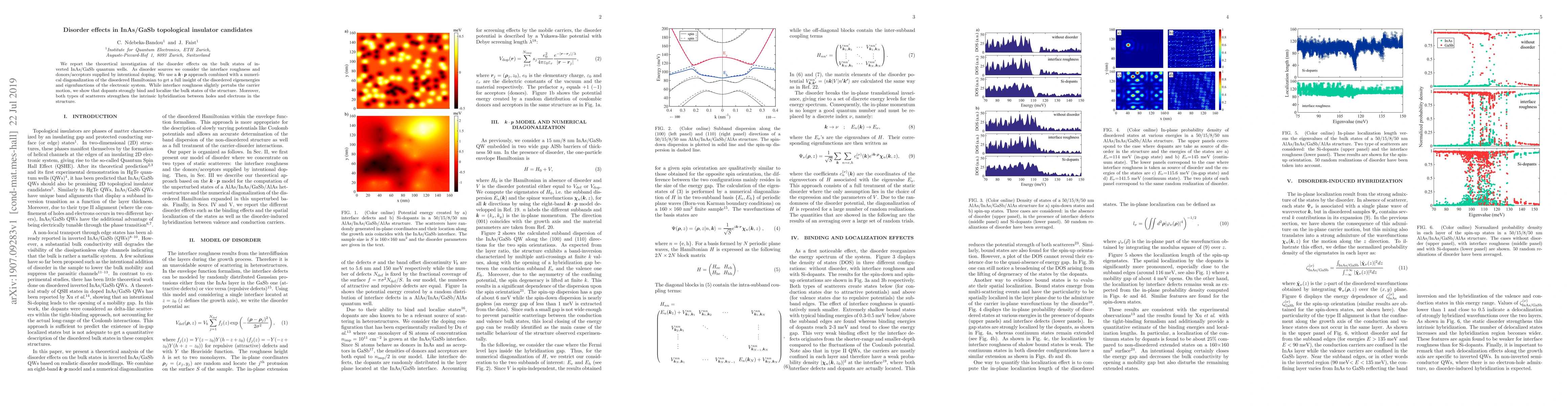 We report the theoretical investigation of the disorder effects on the bulk states of inverted InAs/GaSb quantum wells. As disorder sources we consider the interface roughness and donors/acceptors supplied by intentional doping. We use a $\bm{k}\cdot\bm{p}$ approach combined with a numerical diagonalization of the disordered Hamiltonian to get a full insight of the disordered eigenenergies and eigenfunctions of the electronic system. While interface roughness slightly pertubs the carrier motion, we show that dopants strongly bind and localize the bulk states of the structure. Moreover, both types of scatterers strengthen the intrinsic hybridization between holes and electrons in the structure.
