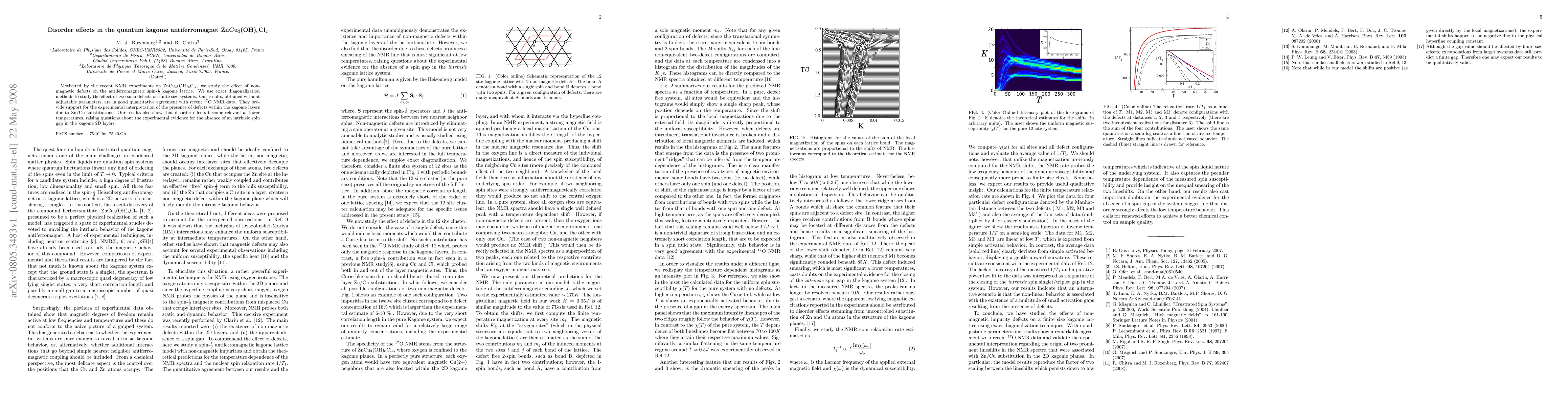 The paper investigates the impact of non-magnetic defects on ZnCu3(OH)6Cl2, a quantum kagome antiferromagnet. Using exact diagonalization for finite systems, the study confirms recent NMR experiment results and supports the experimental interpretation of Zn/Cu substitution-induced defects. The findings suggest disorder effects become significant at lower temperatures, challenging the evidence for a spin gap absence in the kagome 2D layers.