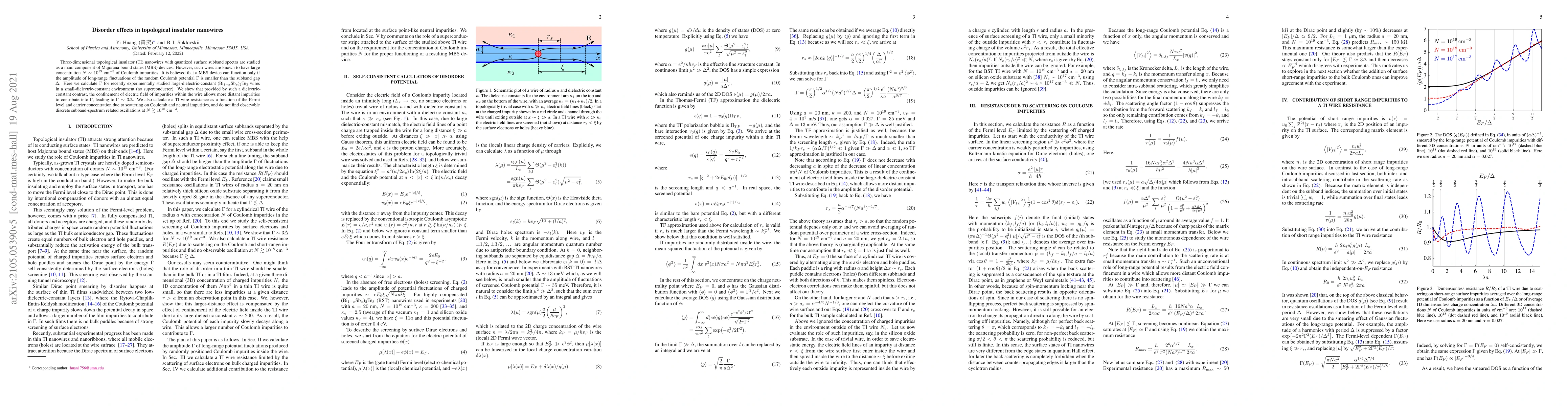 Three-dimensional topological insulator (TI) nanowires with quantized surface subband spectra are studied as a main component of Majorana bound states (MBS) devices. However, such wires are known to have large concentration $N \sim 10^{19}$ cm$^{-3}$ of Coulomb impurities. It is believed that a MBS device can function only if the amplitude of long-range fluctuations of the random Coulomb potential $\Gamma$ is smaller than the subband gap $\Delta$. Here we calculate $\Gamma$ for recently experimentally studied large-dielectric-constant (Bi$_{1-x}$Sb$_x$)$_2$Te$_{3}$ wires in a small-dielectric-constant environment (no superconductor). We show that provided by such a dielectric-constant contrast, the confinement of electric field of impurities within the wire allows more distant impurities to contribute into $\Gamma$, leading to $\Gamma \sim 3\Delta$. We also calculate a TI wire resistance as a function of the Fermi level and carrier concentration due to scattering on Coulomb and neutral impurities, and do not find observable discrete subband-spectrum related oscillations at $N \gtrsim 10^{18}$ cm$^{-3}$.