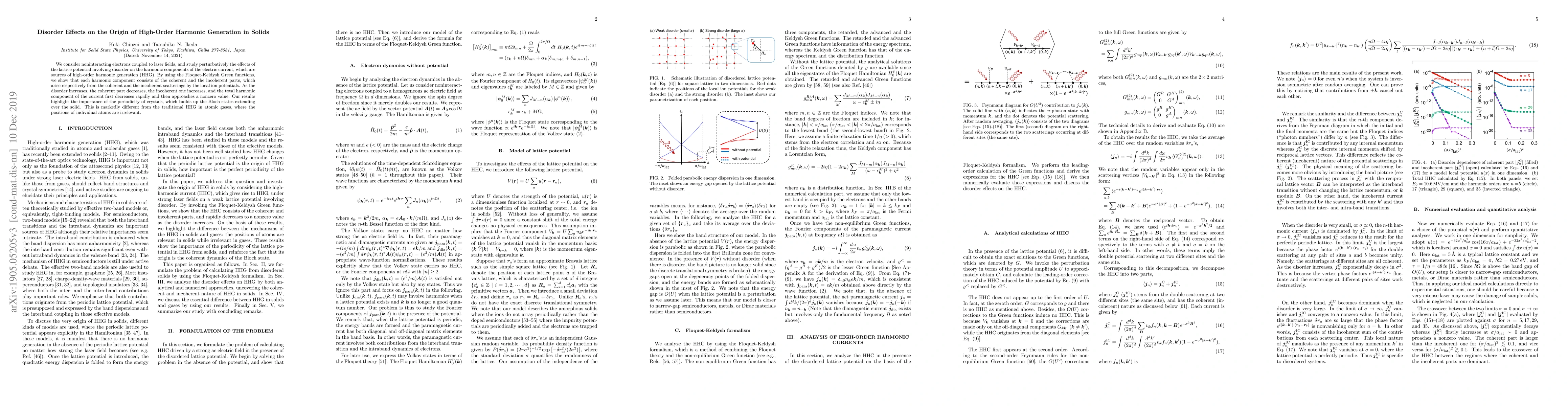 We consider noninteracting electrons coupled to laser fields, and study perturbatively the effects of the lattice potential involving disorder on the harmonic components of the electric current, which are sources of high-order harmonic generation (HHG). By using the Floquet-Keldysh Green functions, we show that each harmonic component consists of the coherent and the incoherent parts, which arise respectively from the coherent and the incoherent scatterings by the local ion potentials. As the disorder increases, the coherent part decreases, the incoherent one increases, and the total harmonic component of the current first decreases rapidly and then approaches a nonzero value. Our results highlight the importance of the periodicity of crystals, which builds up the Bloch states extending over the solid. This is markedly different from the traditional HHG in atomic gases, where the positions of individual atoms are irrelevant.