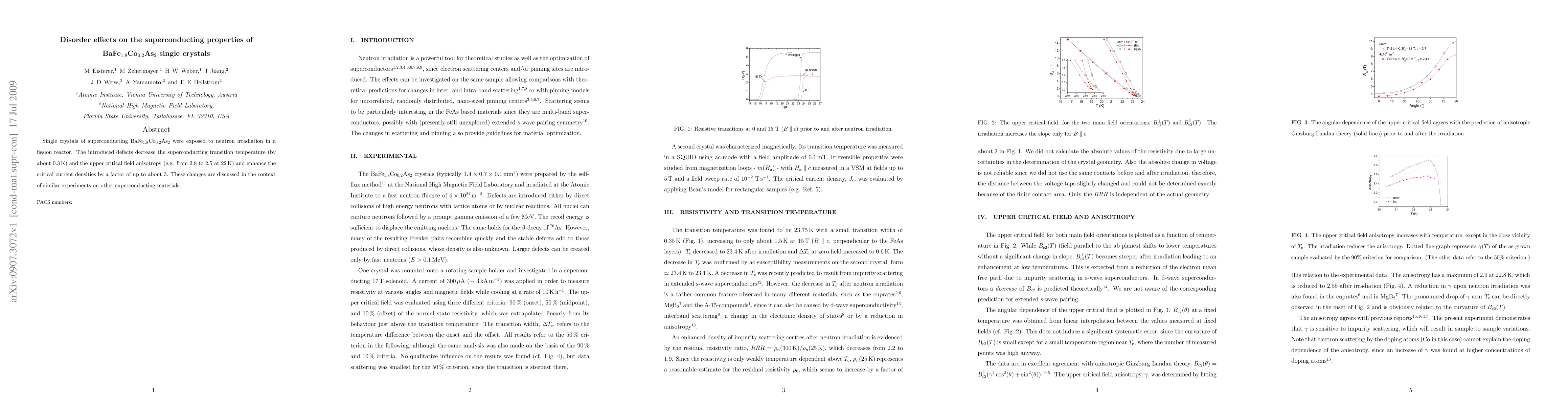 Neutron irradiation of BaFe$_{1.8}$Co$_{0.2}$As$_2$ single crystals lowers the superconducting transition temperature and upper critical field anisotropy while significantly boosting critical current densities. These disorder-induced effects are compared to those observed in other superconducting materials.