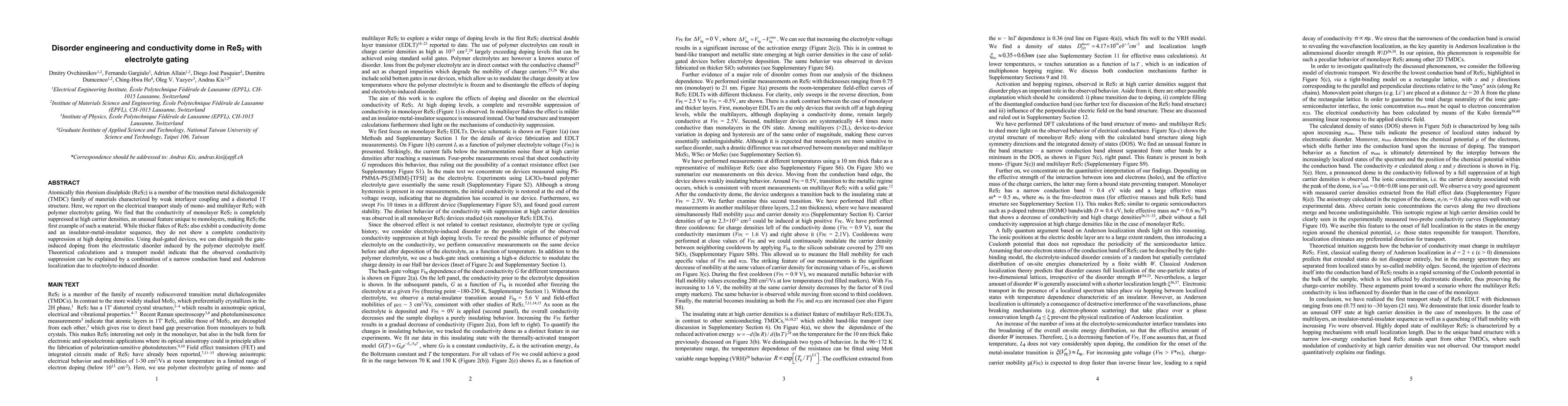 This study investigates the electrical transport in ReS2 under polymer electrolyte gating, revealing that monolayer ReS2 uniquely exhibits complete conductivity suppression at high carrier densities, unlike thicker flakes. Theoretical analysis attributes this behavior to a narrow conduction band and Anderson localization from electrolyte-induced disorder.