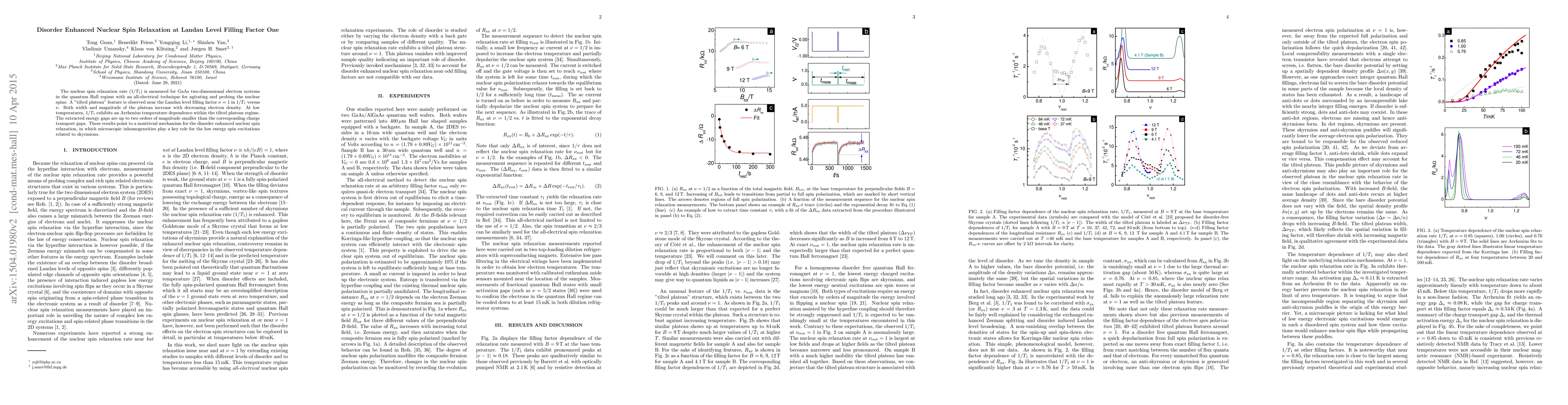 This study measures nuclear spin relaxation in GaAs two-dimensional electron systems under the quantum Hall effect, revealing a "tilted plateau" near Landau level filling factor ν=1. The relaxation rate's Arrhenius dependence at low temperatures suggests a disorder-enhanced mechanism driven by microscopic inhomogeneities and skyrmions.
