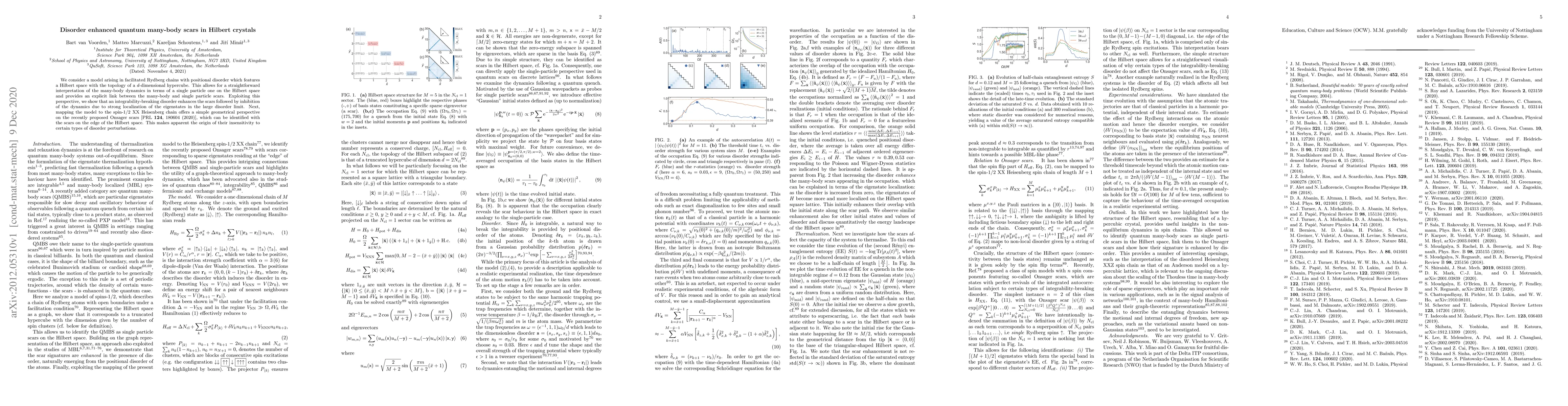We consider a model arising in facilitated Rydberg chains with positional disorder which features a Hilbert space with the topology of a $d$-dimensional hypercube. This allows for a straightforward interpretation of the many-body dynamics in terms of a single particle one on the Hilbert space and provides an explicit link between the many-body and single particle scars. Exploiting this perspective, we show that an integrability-breaking disorder enhances the scars followed by inhibition of the dynamics due to strong localization of the eigenstates in the large disorder limit. Next, mapping the model to the spin-1/2 XX Heisenberg chain offers a simple geometrical perspective on the recently proposed Onsager scars [PRL ${\bf 124}$, 180604 (2020)], which can be identified with the scars on the edge of the Hilbert space. This makes apparent the origin of their insensitivity to certain types of disorder perturbations.