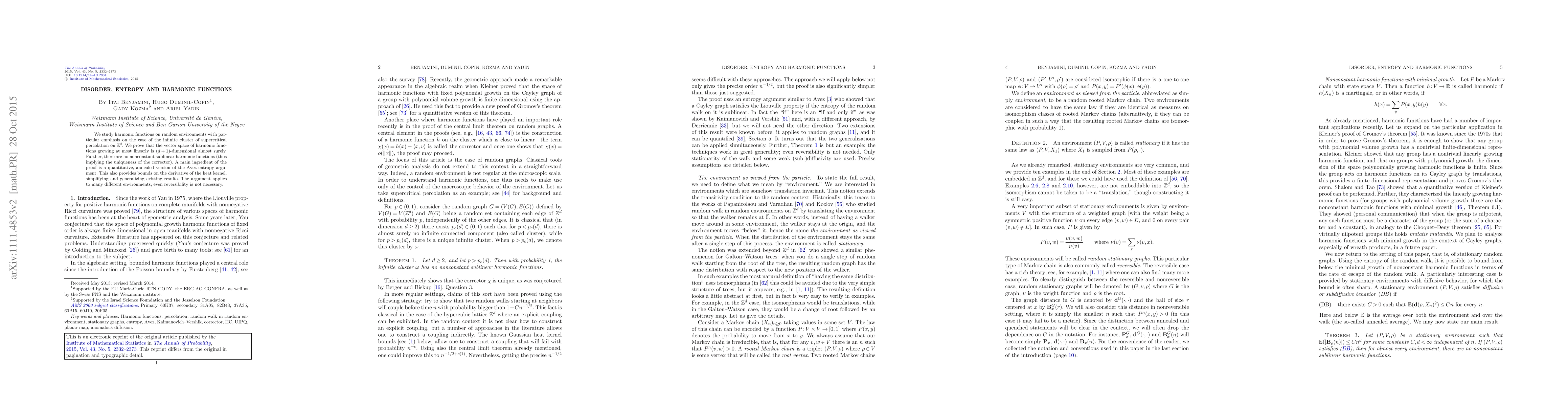 We study harmonic functions on random environments with particular emphasis on the case of the infinite cluster of supercritical percolation on $\mathbb{Z}^d$. We prove that the vector space of harmonic functions growing at most linearly is $(d+1)$-dimensional almost surely. Further, there are no nonconstant sublinear harmonic functions (thus implying the uniqueness of the corrector). A main ingredient of the proof is a quantitative, annealed version of the Avez entropy argument. This also provides bounds on the derivative of the heat kernel, simplifying and generalizing existing results. The argument applies to many different environments; even reversibility is not necessary.