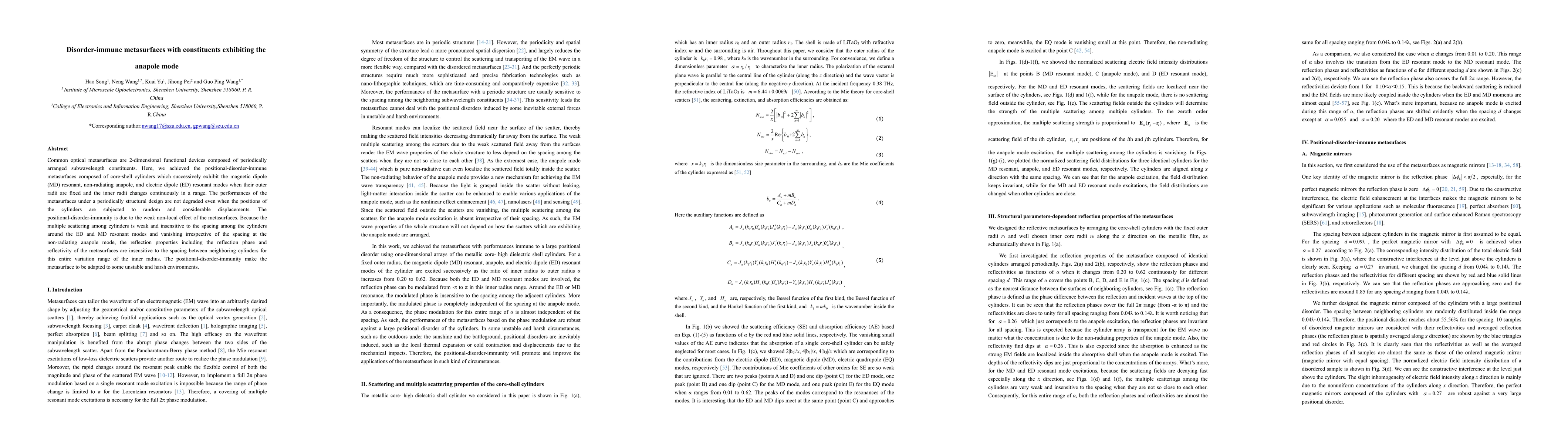 This paper presents disorder-immune metasurfaces composed of core-shell cylinders that exhibit magnetic dipole, anapole, and electric dipole resonant modes. The metasurfaces maintain performance even under significant positional displacements due to weak non-local effects and insensitivity to spacing among cylinders, making them suitable for unstable environments.