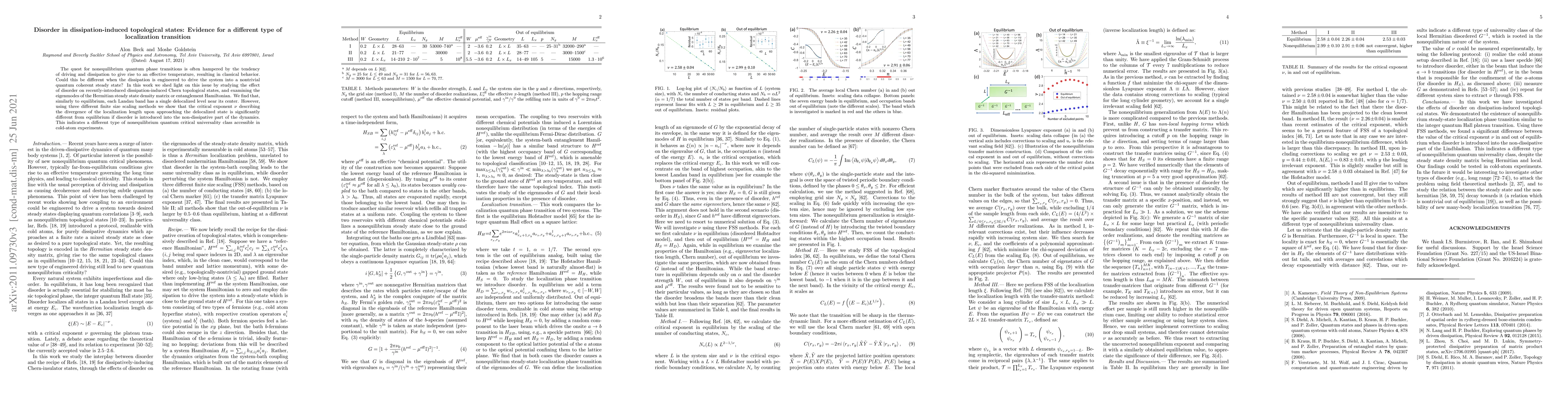 The quest for nonequilibrium quantum phase transitions is often hampered by the tendency of driving and dissipation to give rise to an effective temperature, resulting in classical behavior. Could this be different when the dissipation is engineered to drive the system into a nontrivial quantum coherent steady state? In this work we shed light on this issue by studying the effect of disorder on recently-introduced dissipation-induced Chern topological states, and examining the eigenmodes of the Hermitian steady state density matrix or entanglement Hamiltonian. We find that, similarly to equilibrium, each Landau band has a single delocalized level near its center. However, using three different finite size scaling methods we show that the critical exponent $\nu$ describing the divergence of the localization length upon approaching the delocalized state is significantly different from equilibrium if disorder is introduced into the non-dissipative part of the dynamics. This indicates a different type of nonequilibrium quantum critical universality class accessible in cold-atom experiments.