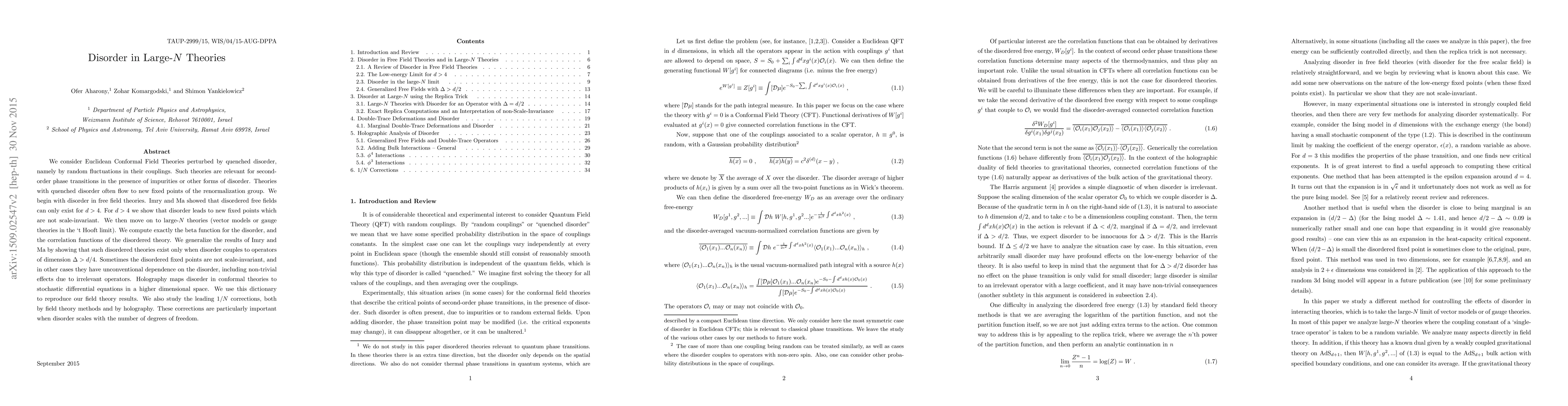 Researchers study how disorder affects large-N theories in physics, finding that disordered theories can have new fixed points with non-scale-invariant properties, and that these effects become more significant as the number of degrees of freedom increases.