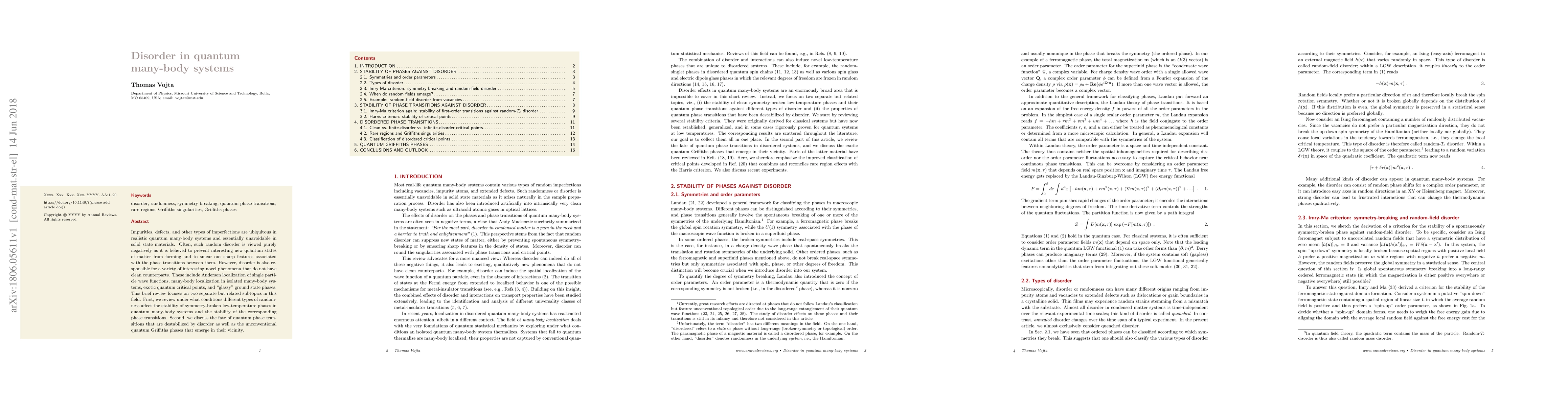 This paper reviews how disorder in quantum many-body systems can lead to novel phenomena such as many-body localization and exotic quantum critical points. It specifically examines how randomness affects the stability of symmetry-broken phases and explores the emergence of unconventional quantum Griffiths phases in disordered systems.